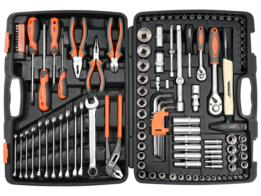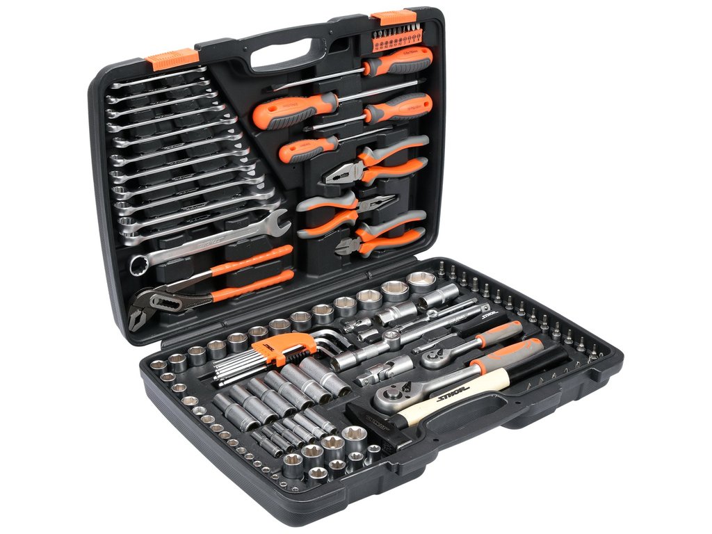 Sada obsahuje kompletní sortiment dlouhých a krátkých nástrčných klíčů 1/4, 3/8 a 1/2, prodlužovací nástavce, univerzální klouby a mnoho dalších prvků, včetně 45zubých ráčen.