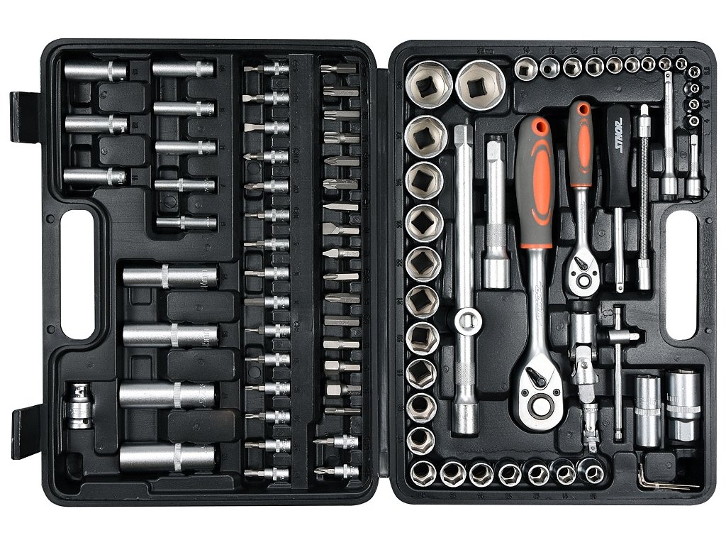 Sada obsahuje dvě ráčny, celou řadu bitů, adaptérů, nástavců 1/2"a 1/4" vše uspořádáno v přehledných pozicích.