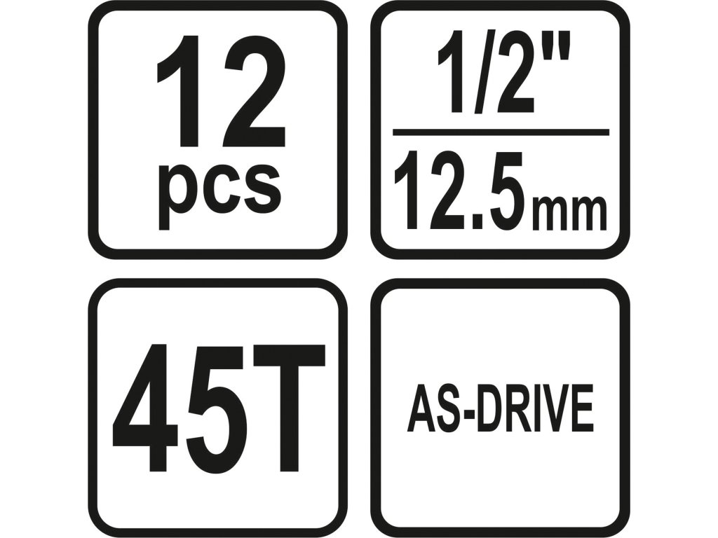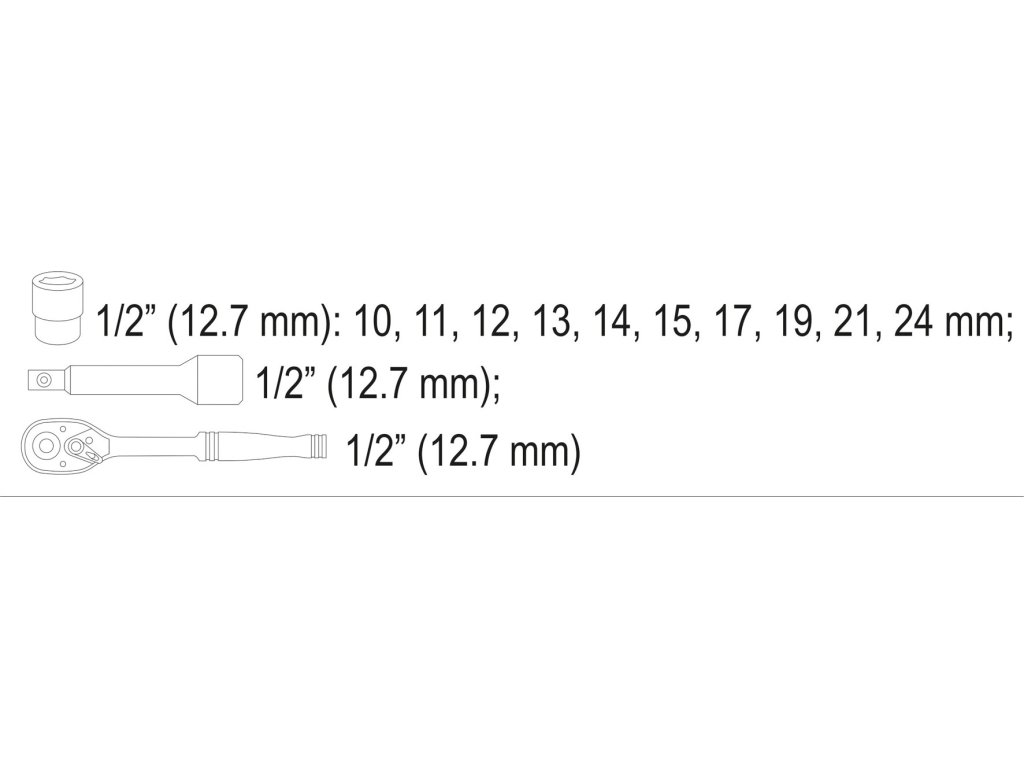 - 10x nástavec 1/2": 10; 11; 12; 13; 14; 15; 17; 19; 21; 24 mm