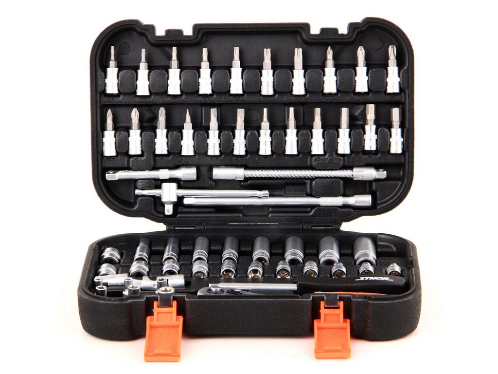 Sada obsahuje kompletní sortiment 1/4" dlouhých a krátkých nástrčných klíčů, prodlužovacích nástavců, univerzálního kloubu a mnoha dalších prvků, včetně 45zubé ráčny. Díky této konfiguraci je sada vhodná pro menší montážní práce, mechanické opravy a mnoho dalších úkolů v domácnosti nebo dílně.