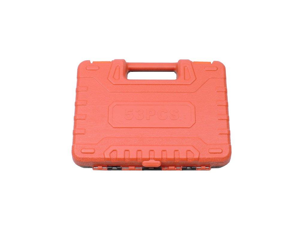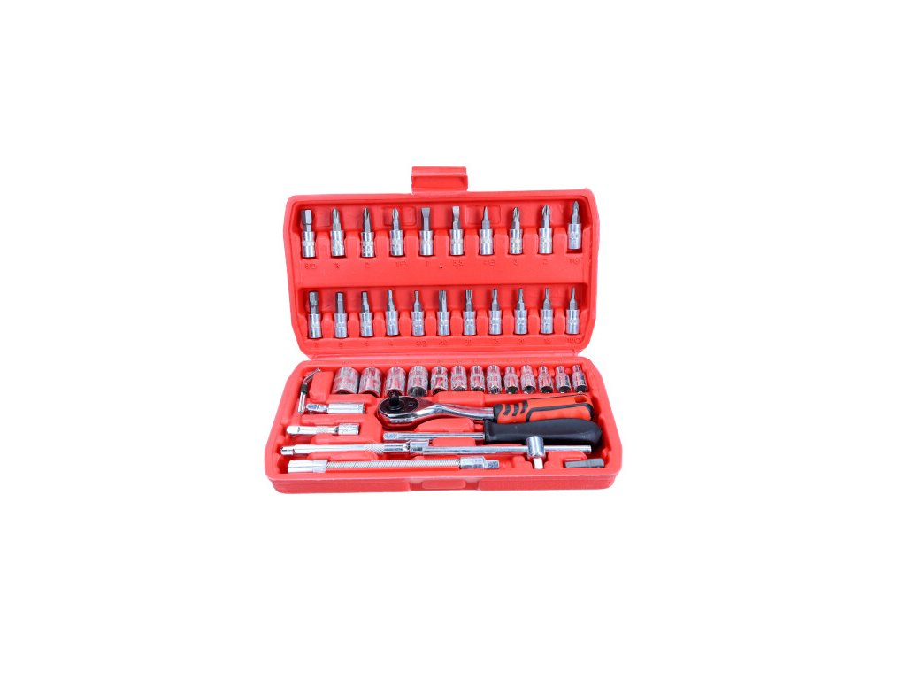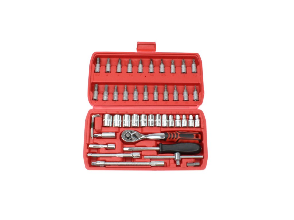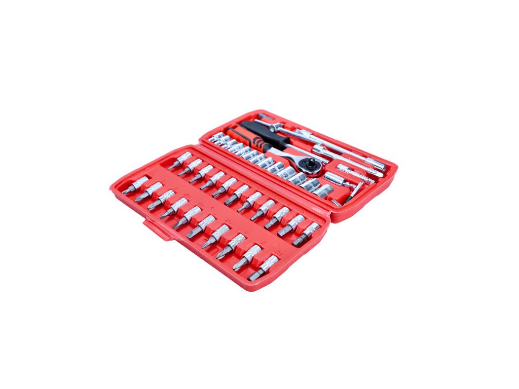 – 1 x ráčna 1/4" se 72 zuby – 13 x nástrčné klíče 1/4": 4; 4,5; 5; 5,5; 6; 7; 8; 9; 10; 11; 12; 13; 14 mm – 6 x bitů šroubováku TORX: T10; T15; T20; T25; T30; T40 – 6 x bitů šroubováku HEX: 3; 4; 5; 6; 7; 8 mm – 3 x bitů šroubováku Phillips: Ph1; Ph2; Ph3 – 3 x bitů šroubováku Pozidriv: Pz1; Pz2; Pz3 – 3 x bity plochého šroubováku: 4; 5,5; 7 mm – 2 x 1/4" prodlužovací nástavce: 50; 100 mm – 1 x 1/4" šroubovák s rukojetí, 150 mm – 1 x 1/4" posuvná rukojeť, 115 mm – 1 x 1/4" flexibilní prodlužovací nástavec, 150 mm – 1 x 1/4" univerzální kloub – 1 x 1/4" adaptér na bit – 4 x 1,27; 1,5; 2; 2,5" imbusové klíče – pouzdro