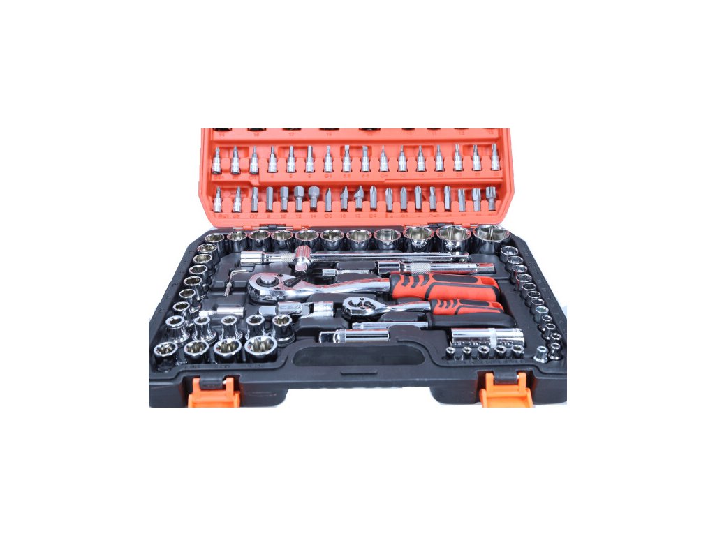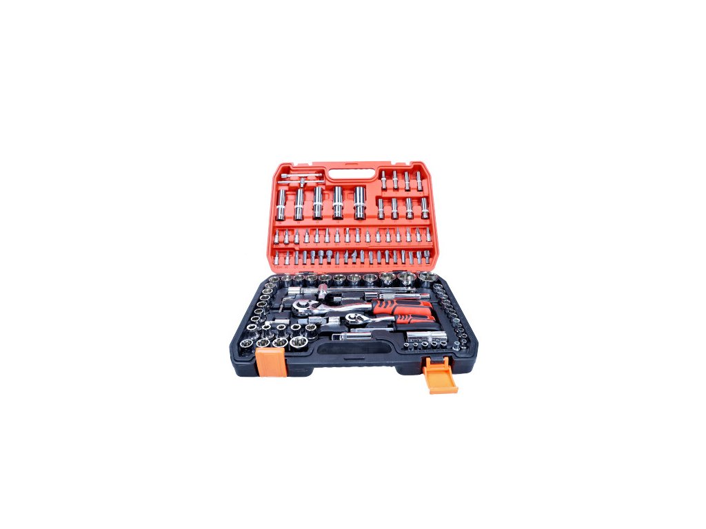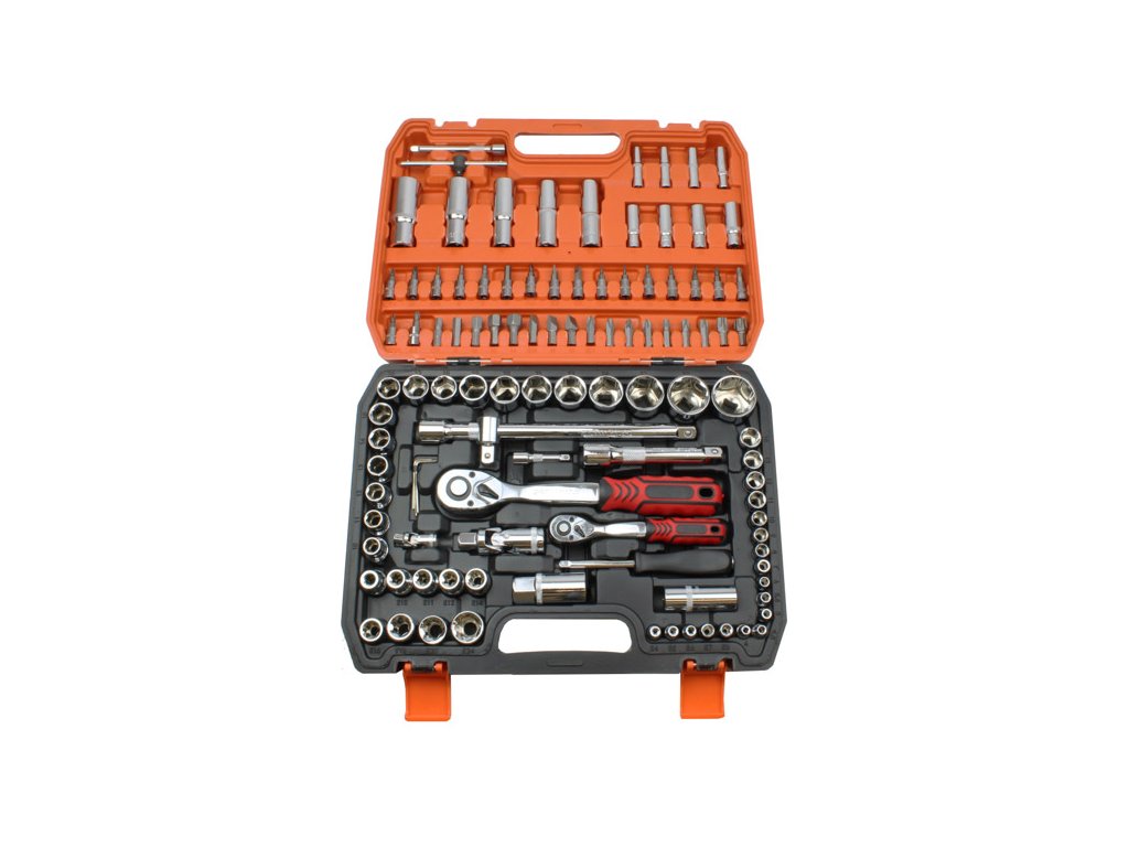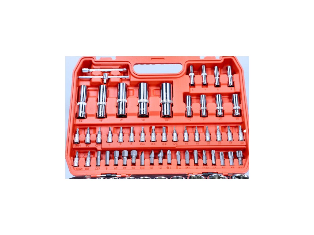 – Ráčny 72 zubů 1/2″ a 1/4″ – Nástrčné klíče 1/2″: 10, 11, 12, 13, 14, 15, 16, 17, 18, 19, 20, 21, 22, 24, 27, 30, 32 mm – Nástrčné klíče dlouhé 1/2″: 14, 15, 17, 19 mm – Nástrčné klíče na zapalovací svíčky 1/2″: 16, 21 mm – Nástrčné klíče 1/4″: 4, 4,5, 5, 5,5, 6, 7, 8, 9, 10, 11, 12, 13, 14 mm – Nástrčné klíče dlouhé 1/4″: 6, 7, 8, 9, 10, 11, 12, 13 mm Nástrčné klíče 1/4″ s bity: – Torx (T8, T10, T15, T20, T25, T30) – Imbus (3, 4, 5, 6 mm) – PZ (1, 2) – PH (1, 2) – Plochý (4, 5, 5, 7 mm) Bity: – Imbus (6, 8, 10, 12, 14 mm) – PH (3, 4) – Plochý (8, 10, 12 mm) – PZ (3, 4) – Torx (T40, T45, T50, T55) – 1/2″ ořechové hlavice a šroubováky s bity – 1/2″ adaptéry na bity – 1/2″ prodlužovací nástavce (125, 250 mm) a 1/4″ (50, 100 mm) – 1/2″ průvlečný kus – T-rukojeť s 1/4″ čtyřhranem – 1/2″ a 1/4″ univerzální klouby – Šestihranný objímkový klíč typ l (1,5, 2, 3 mm) – Torx patice (E4, E5, E6, E7, E8, E10, E11, E12, E14, E16, E18, E20, E24)