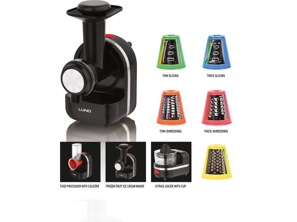 Multifunkční kuchyňský robot 3v1 vhodný ke krájení, mletí a tvorbě nápojů.