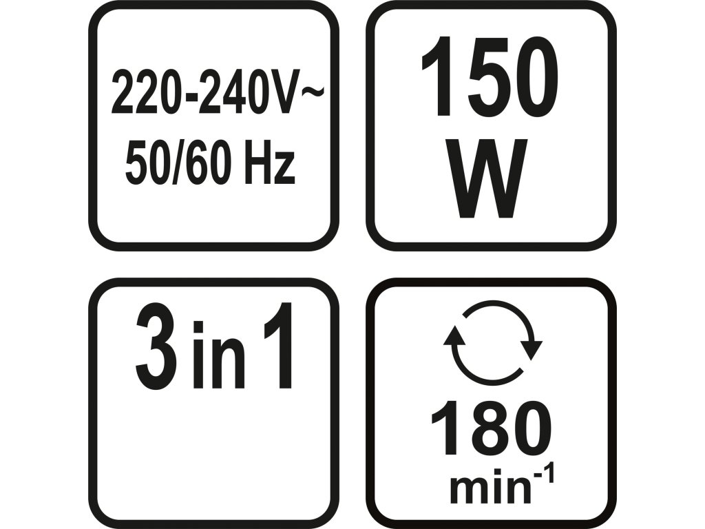 Snadná a rychlá práce je zajištěna motorem s výkonem 150W. Zařízení pracuje se 180 ot./min.. Napájení je řešeno standardně pomocí kabelu 230V.