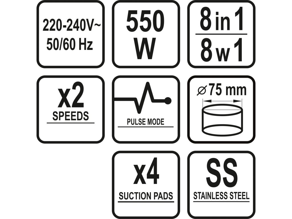 Snadná a rychlá práce je zajištěna výkonným 550W motorem se (špičkovým příkonem 850W). Zařízení pracuje až s 18000 ot./min. (u mixéru). Napájení je řešeno standardně pomocí kabelu 230V.