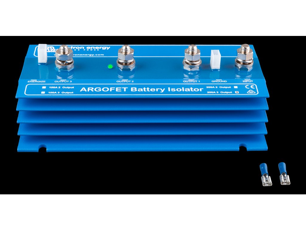 Oddělovač akumulátorů Argo FET 100-2 umožňují současné nabíjení dvou akumulátorů z jednoho alternátoru nebo z jednoho výstupu nabíječky akumulátorů bez toho, aniž by byly akumulátory vzájemně spojené.