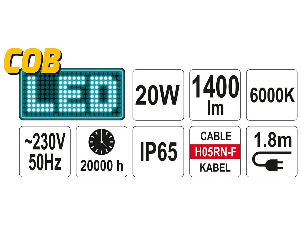 Reflektor přenosný s vysoce svítivou COB LED, 20W, 1400lm