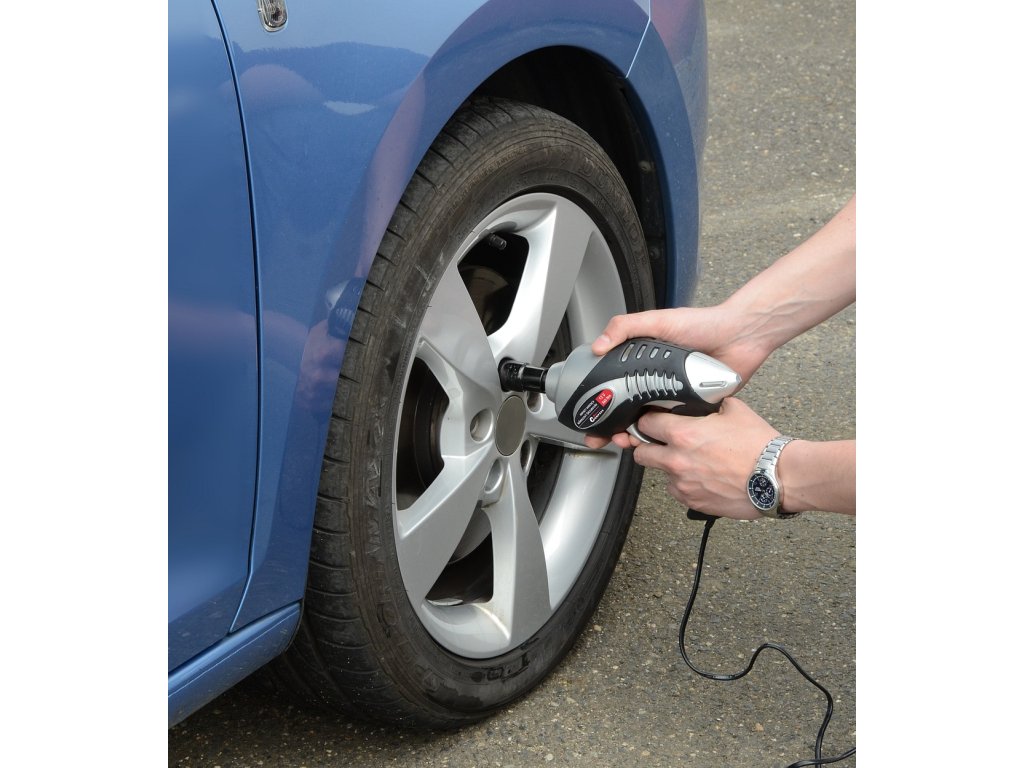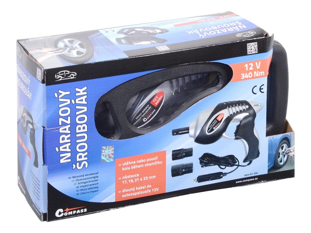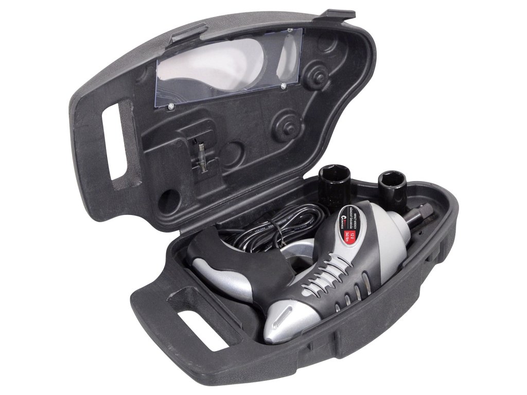 V uzavíratelném plastovém kufříku, obsahuje vyměnitelné nástavce z chrom-vanadiové oceli pro šrouby/matice kol 17, 19, 21 a 23 mm. Dlouhý kabel se zástrčkou do zásuvky automobilového zapalovače 12V umožňuje pohodlně utáhnout všechny kola vozidla.