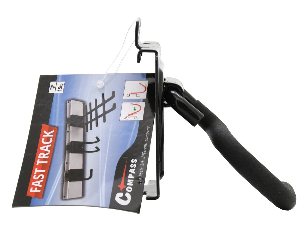 Závěsný prvek pro systém FAST TRACK s klasickým tvarem háčku pro uchycení různých předmětů, zejména nářadí s násadami.