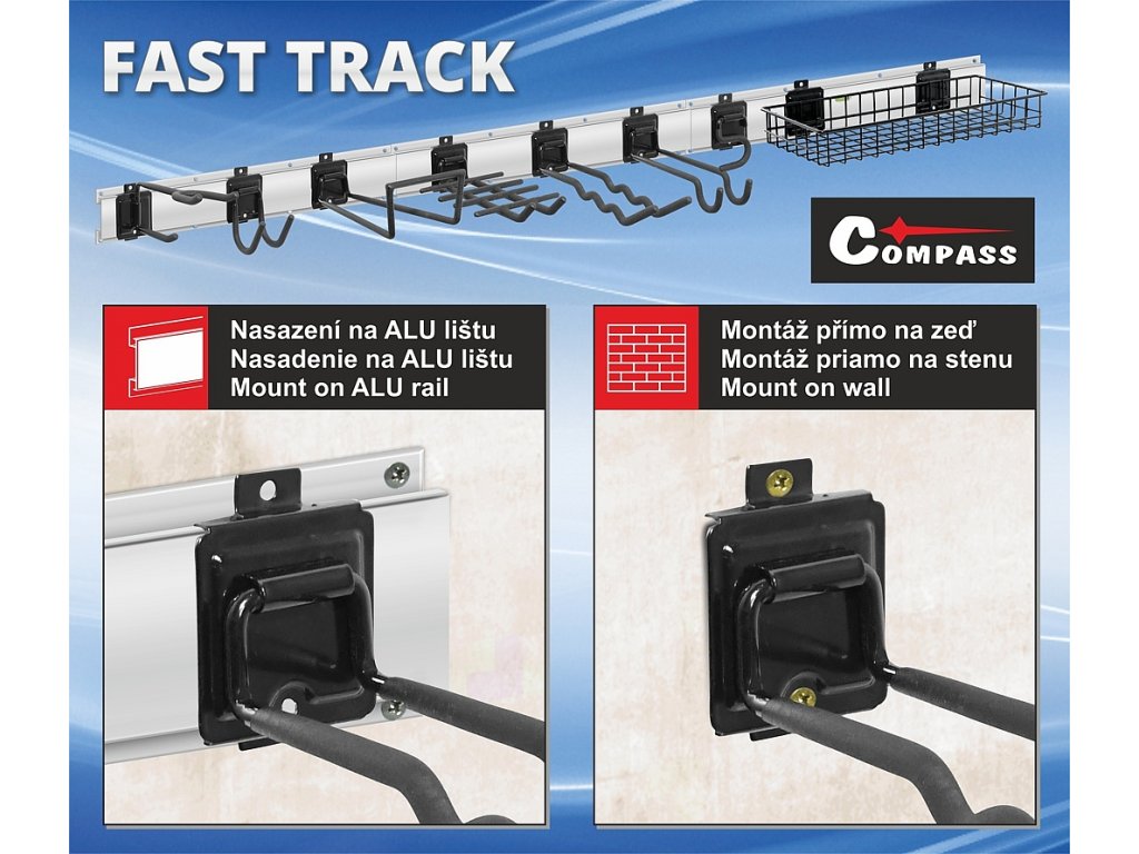 Závěsné prvky je možné přichytit přímo do zdi, nebo pomocí systému FAST TRACK přichytit na lyžinu.
