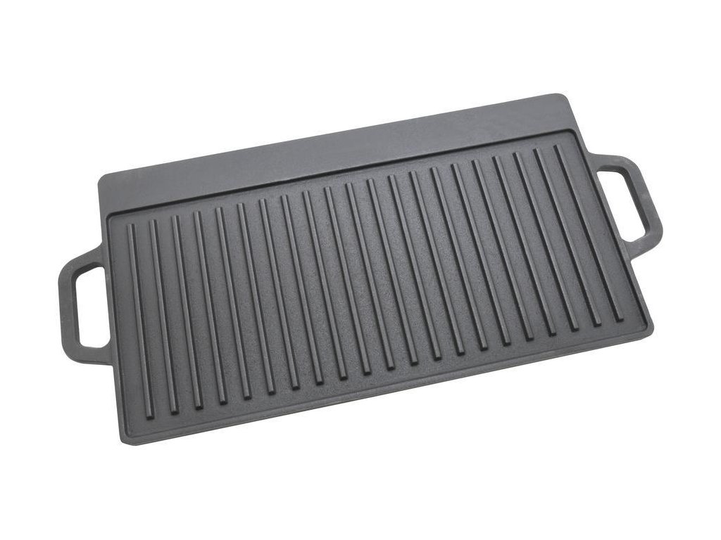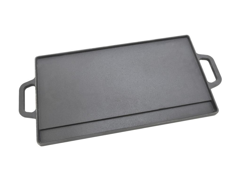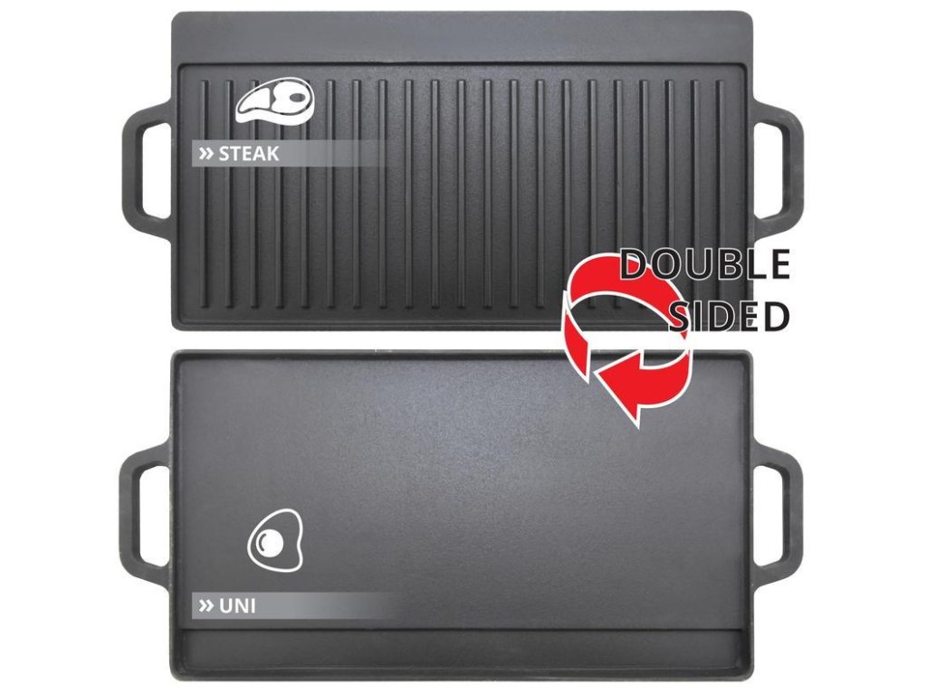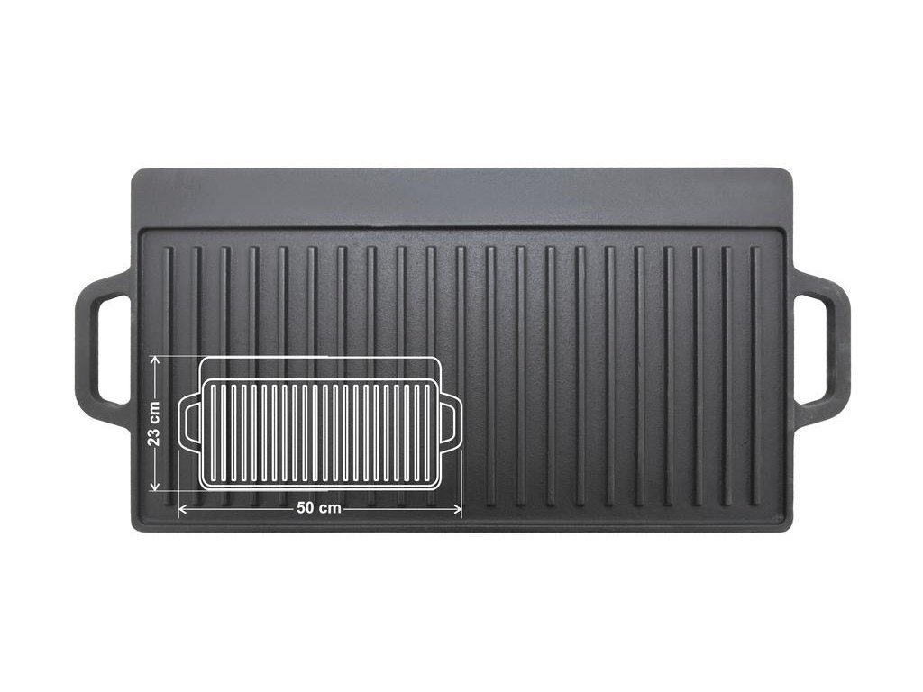 Je oboustranný a nabízí prostor pro tepelnou úpravu masitých pokrmů s typickou drážkovanou strukturou.