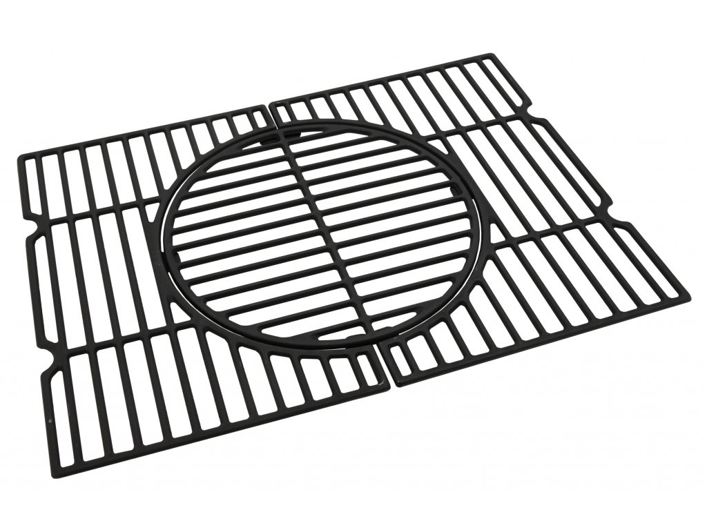 Litinový rošt s třídílnou konstrukcí s celkovými rozměry 58 x 42 cm se středovou částí o průměru 31 cm.