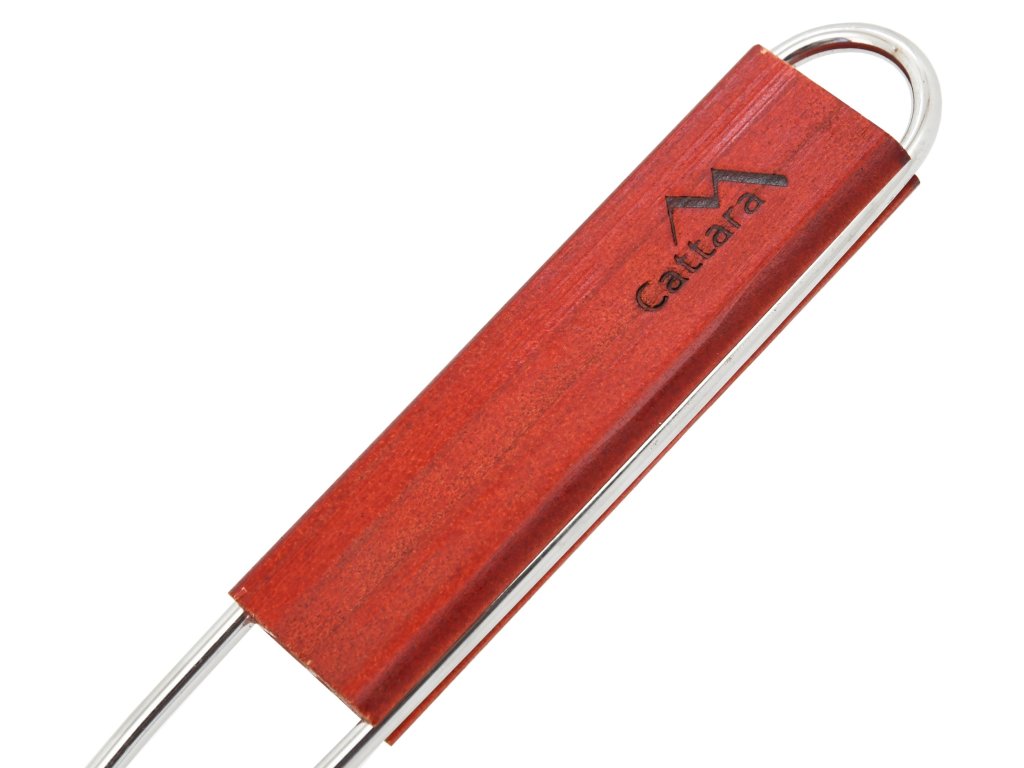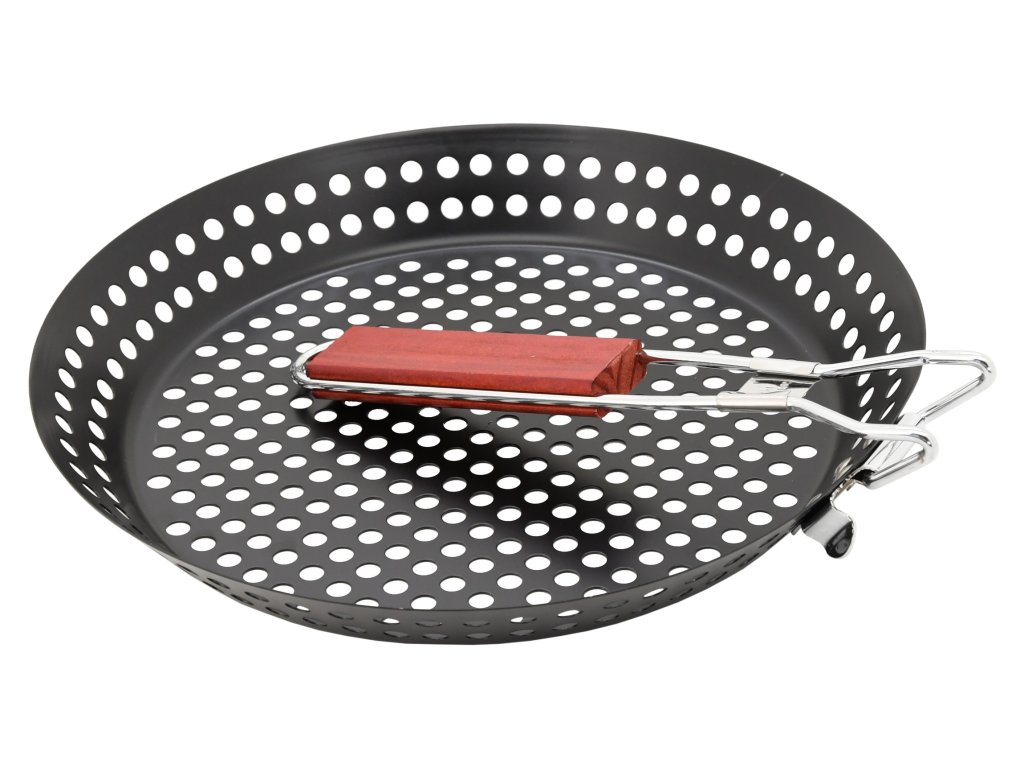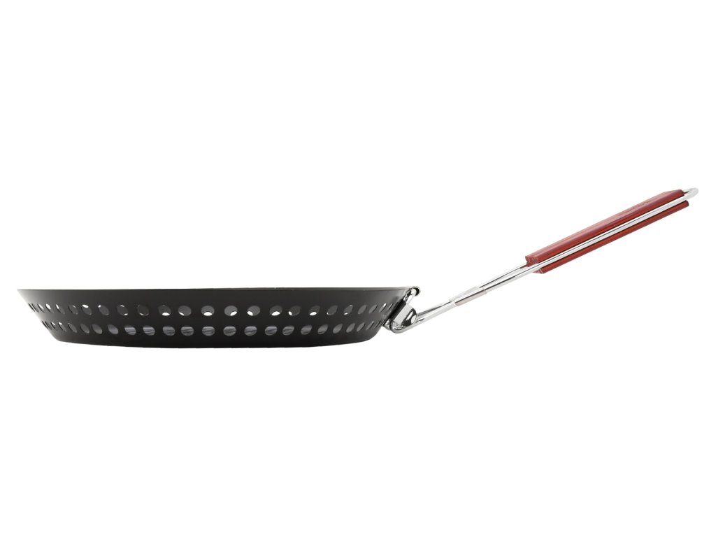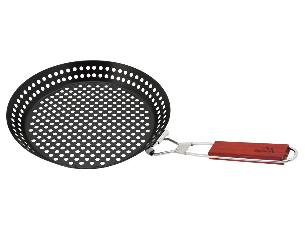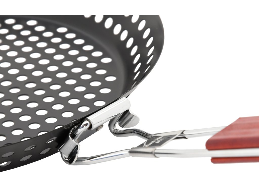 Pánev lze snadno přenášet, zejména díky sklápěcí rukojeti. Rukojeť je vyrobena z nerezové oceli, v úchopové části doplněné dřevěným obložením pro pohodlnější úchop.