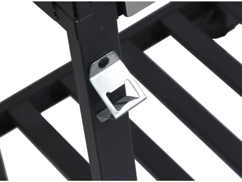 Vysoce stabilní konstrukce z precizně opracované oceli je opatřená odolnou, hrubě černou barvou. Konstrukce je doplněna 2x kolečky usnadňující mobilitu grilu. Rám ve spodní časti slouží pro další zvýšení stability a rovněž jako odkládací prostor. Boční strany jsou doplněny sklápěcími poličkami pro odkládání rozličného vybavení pro grilování, nebo samotných pokrmů.