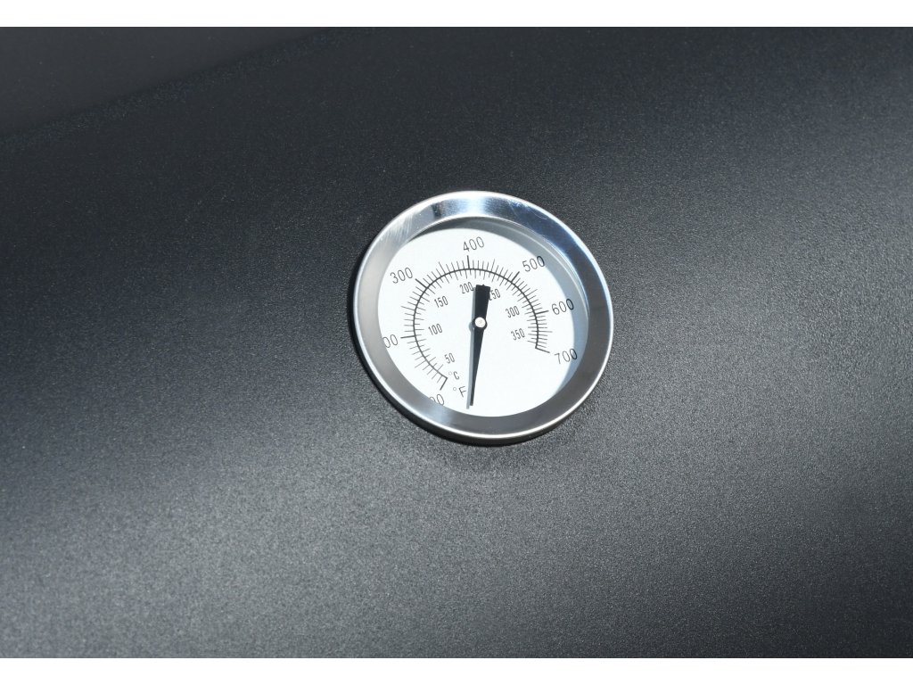 Víko je opatřené vestavěným teploměrem pro kontrolu teploty, rozměrná grilovací plocha s chromovanou mřížkou a praktická odkládací police v přední části grilu zajistí pohodlnou přípravu pochutin.