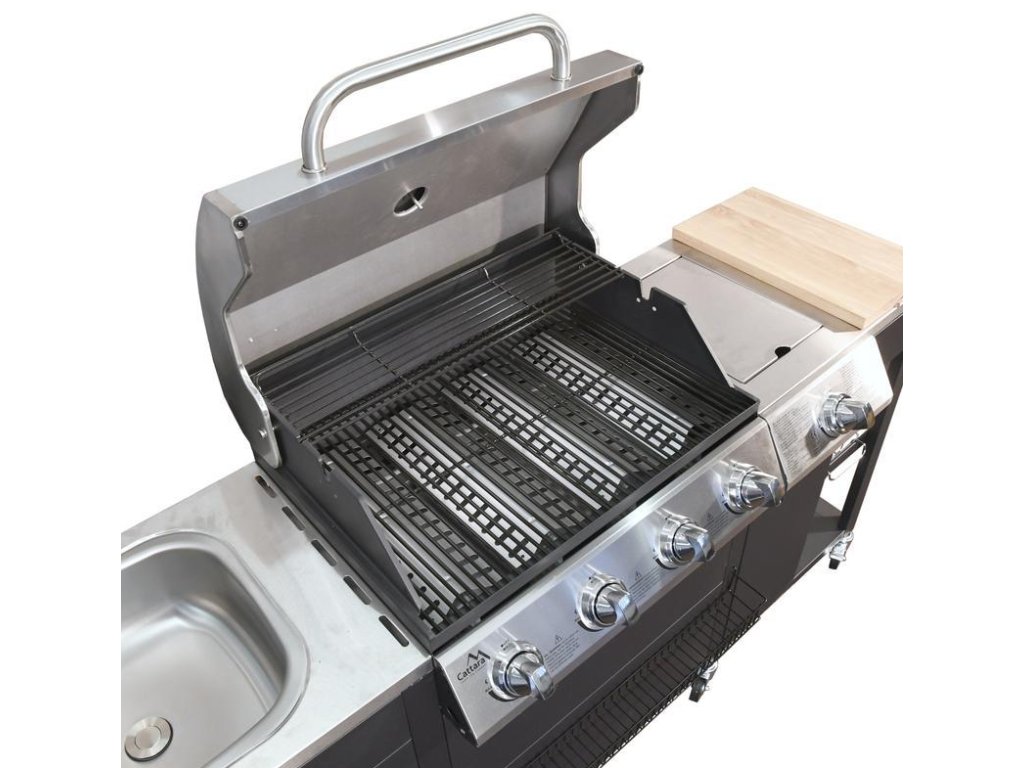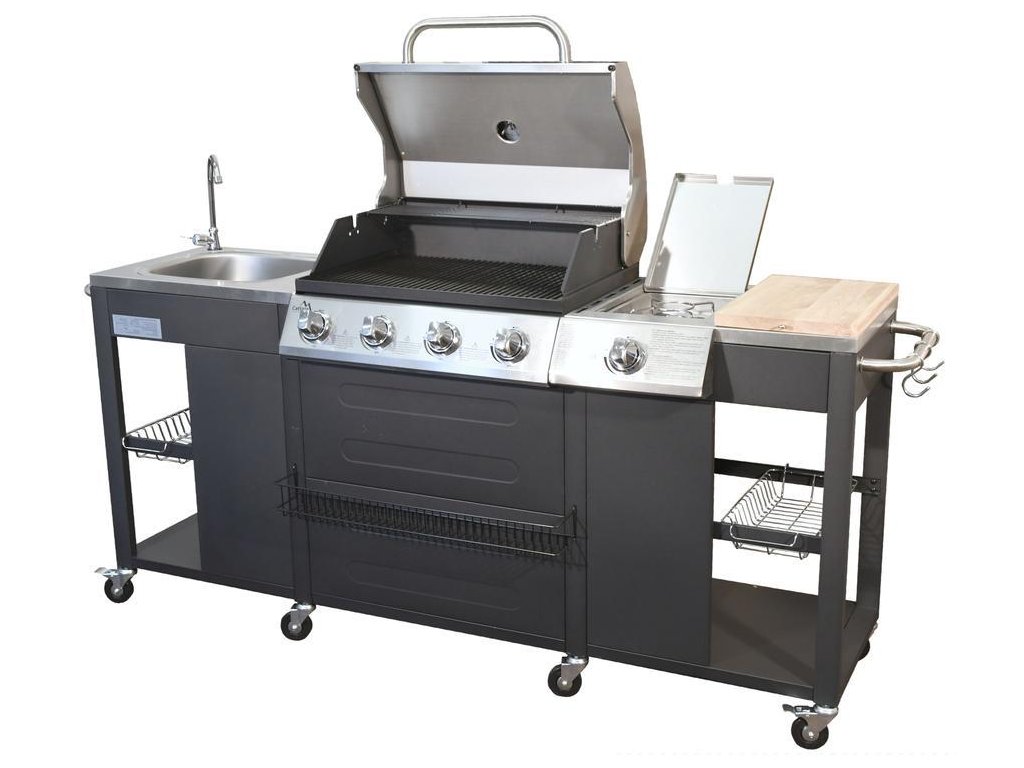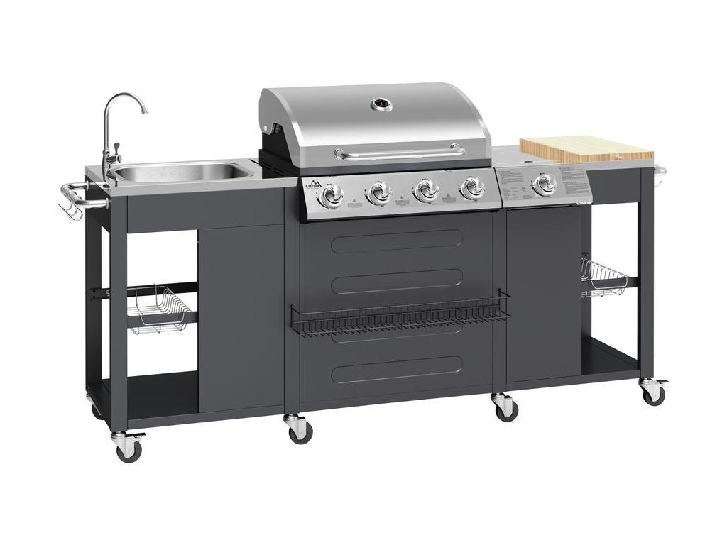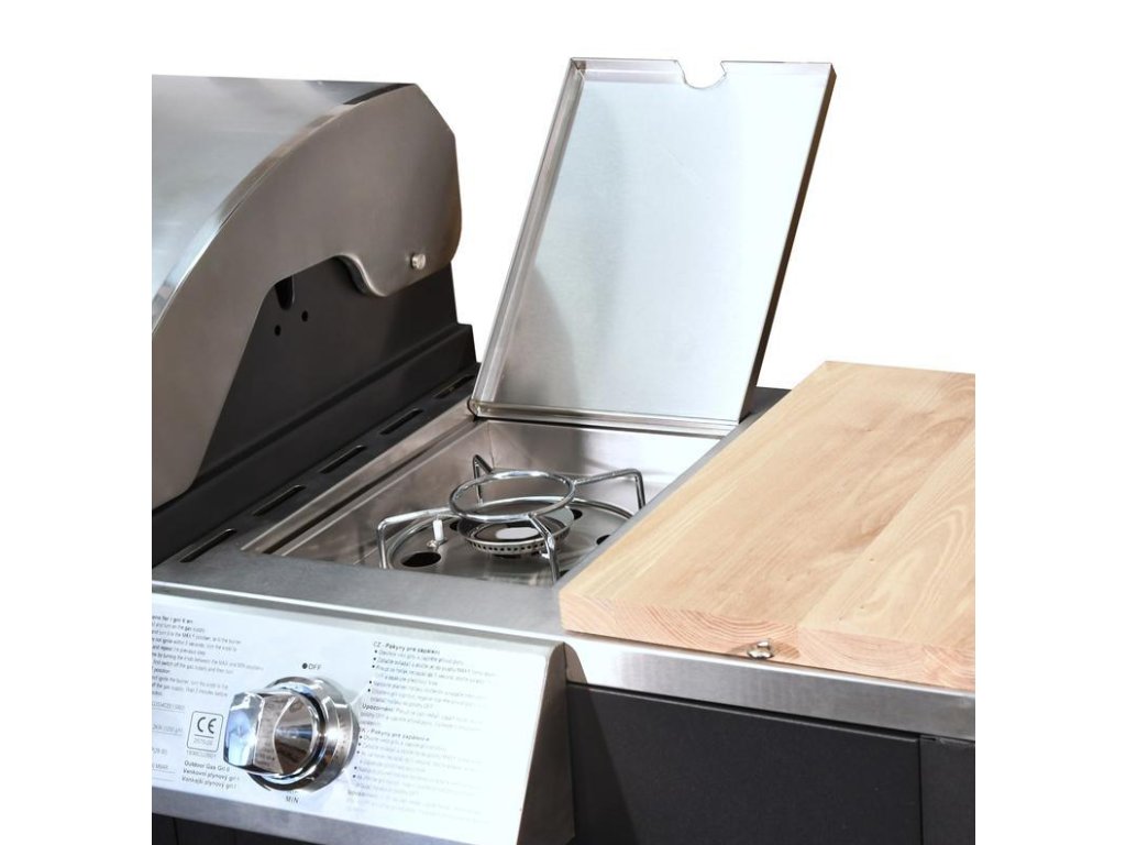 Hlavní grilovací prostor je osazen 4x hořáky se samostatnou regulací a piezo zapalováním. Díky možnosti vypnout prostřední hořáky je gril vhodný jak pro přímé, tak pro nepřímé grilování, je vybaven teploměrem a odkládacím roštem pro udržování teplot již hotových pokrmů. Celá zahradní kuchyně je doplněna vařičem se samostatnou regulací a piezo zapalováním. Součástí je i spojovací hadice k plynové lahvi a redukční ventil.