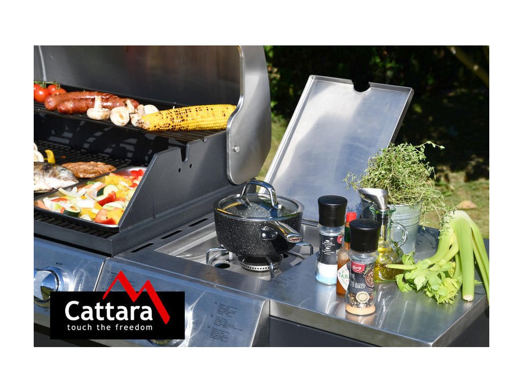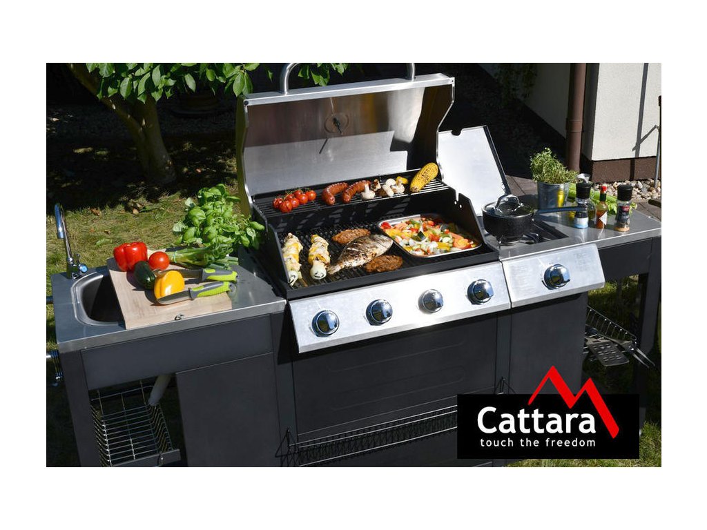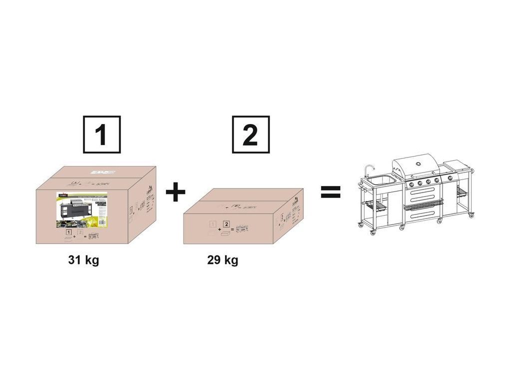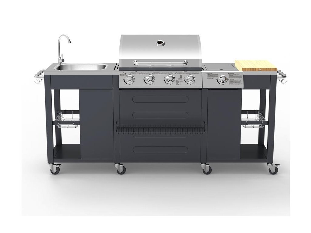 Hlavní grilovací prostor je osazen 4x hořáky se samostatnou regulací a piezo zapalováním. Díky možnosti vypnout prostřední hořáky je gril vhodný jak pro přímé, tak pro nepřímé grilování, je vybaven teploměrem a odkládacím roštem pro udržování teplot již hotových pokrmů. Celá zahradní kuchyně je doplněna vařičem se samostatnou regulací a piezo zapalováním. Součástí je i spojovací hadice k plynové lahvi a redukční ventil.