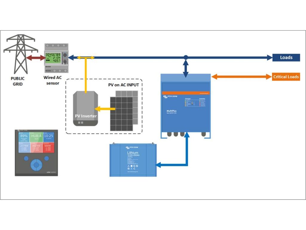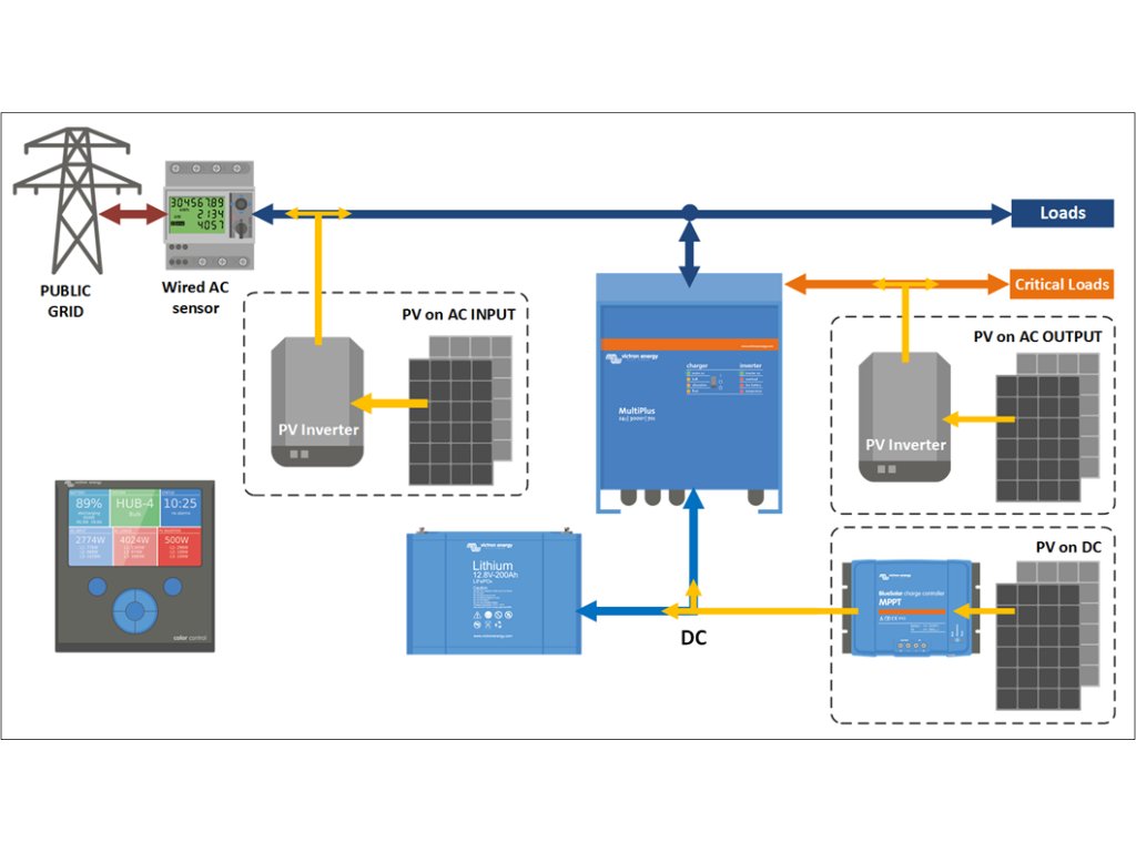 Jakmile měřák zaznamená dodávku do distribuční sítě (dále jen DS), ESS systém začne ukládat přebytečnou energii do baterie. Jakmile měřák sítě zaznamená nákup energie z distribuční sítě, systém ESS dodává energii z baterie do zátěže. V případě výpadku DS fotovoltaika nejde a kritické spotřebiče (ve schématu „Critical Loads) jsou napájeny z AC výstupu jednotky MultiPlus/Quattro – to zajistí, že nám baterii vybíjí jen prioritní spotřebiče a neprioritní jsou odpojeny.