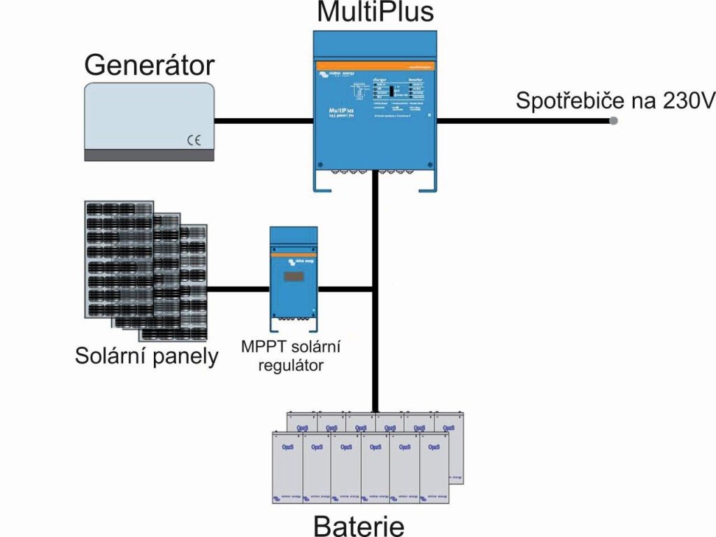 MultiPlus/Quattro je připojen k baterii a přes AC1 výstup dodává energii spotřebičům. Na AC vstup můžeme napojit generátor, který může být startován i automaticky na základě požadavku z měniče nebo ručně. Jakmile se nastartuje generátor, jednotka dodává energii do AC výstupu 1 a 2 a současně nabíjí baterie spolu se solárními panely. Jakmile se generátor vypne, pak je energie opět dodávána z baterie/solárních panelů. Jednotka má dva výstupy pro zátěž – první výstup je funkční stále, druhý výstup pouze když běží generátor.