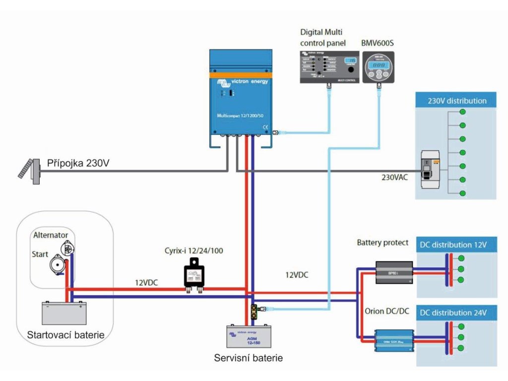 Jednotka MultiPlus se postará o komplexní řešení dodávky energie na palubě. Jakmile se připojíme k el. přípojce např. v garáži, jednotka MultiPlus odebírá energii pro napájení spotřebičů a současně nabíjí baterii. Jakmile odpojíme od přípojky, energie je dodávána z baterie.