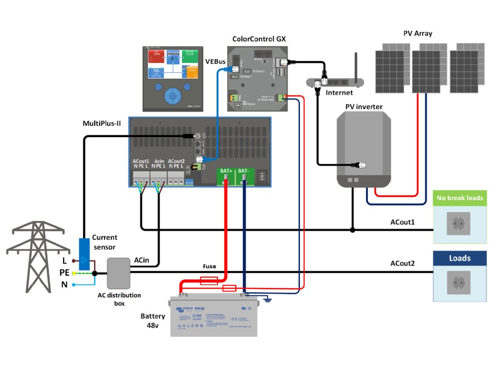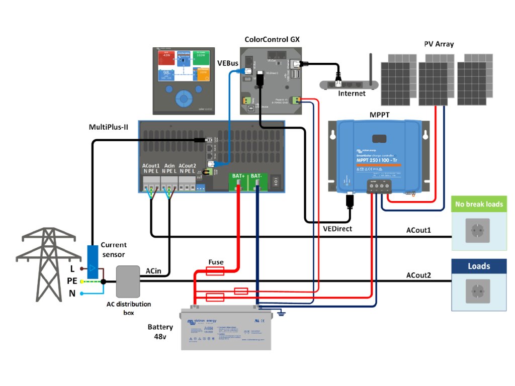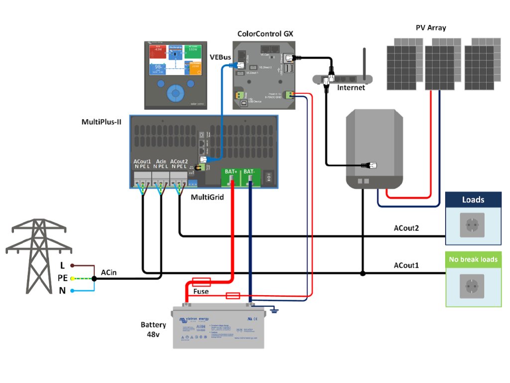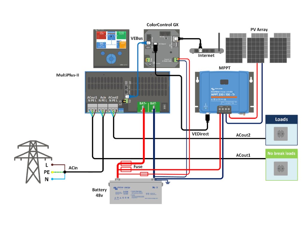 MultiPlus-II je klíčovým prvkem v systému Victron ESS, který poskytuje flexibilitu pro kombinaci se solárními MPPT regulátory nebo se síťovými FV měniči.