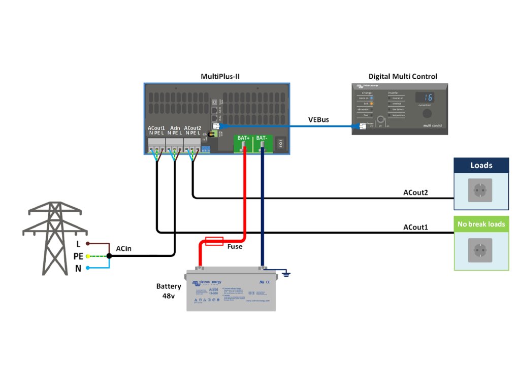 1. Základní instalace jednotky MultiPlus-II s externím digitálním multifunkčním panelem (volitelné). Určeno do systémů, kdy není vždy dostupná síť (typicky karavany, lodě), režim UPS. Spotřebiče na AC out-1 jsou napájeny jak ze sítě (přednostně), tak z baterie. Spotřebiče na AC- out2 jsou napájeny pouze ze sítě, v případě výpadku sítě nejsou napájeny.