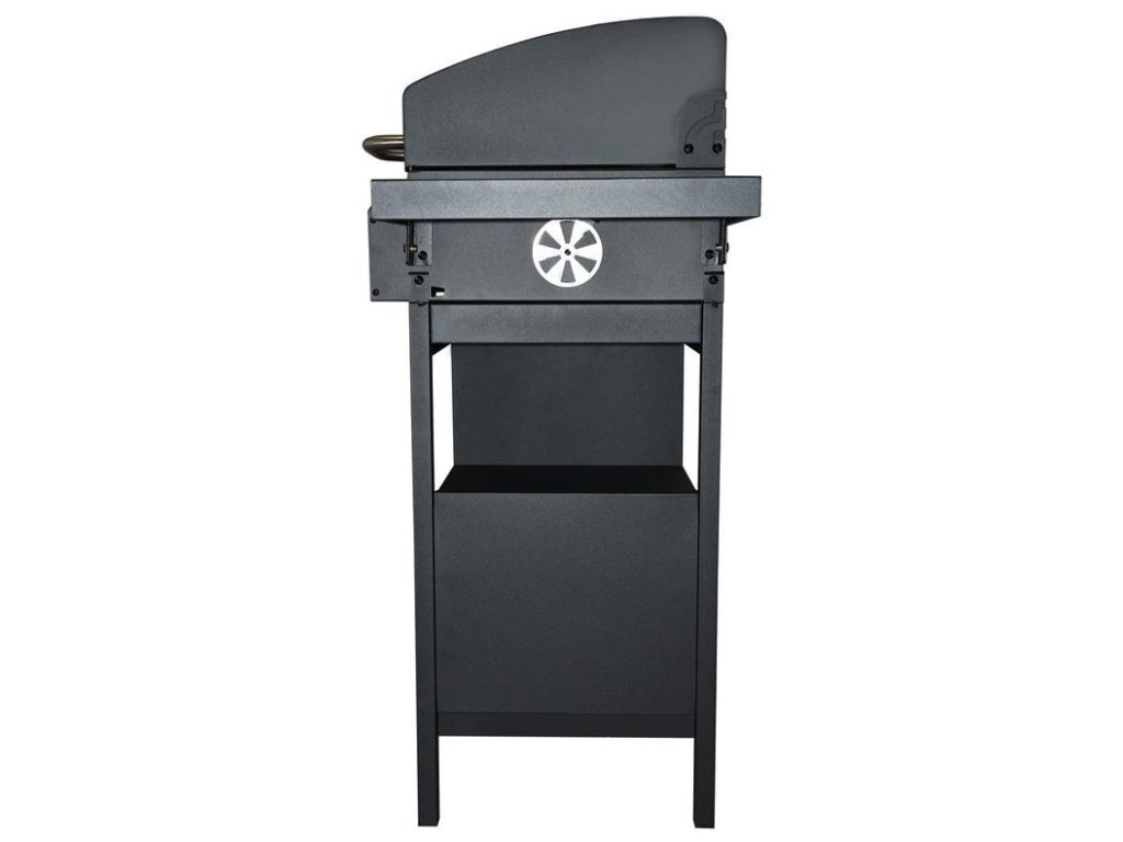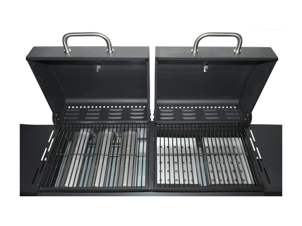 Konstrukce je vyrobena z kvalitní oceli s odolným černým povrchem. Madla z nerezi mají dostatečný prostor pro úchop a zvyšují eleganci grilu. Gril je opatřen kolečky z odolného plastu pro zajištění dostatečné pohyblivosti. Víka grilu jsou opatřena teploměry a boky grilovacích prostorů jsou doplněny regulovatelnou ventilací.