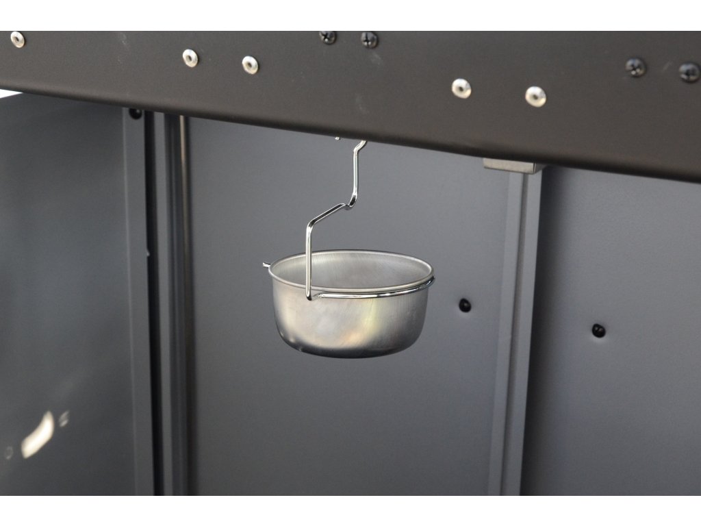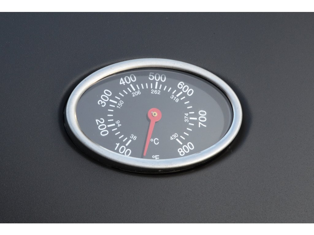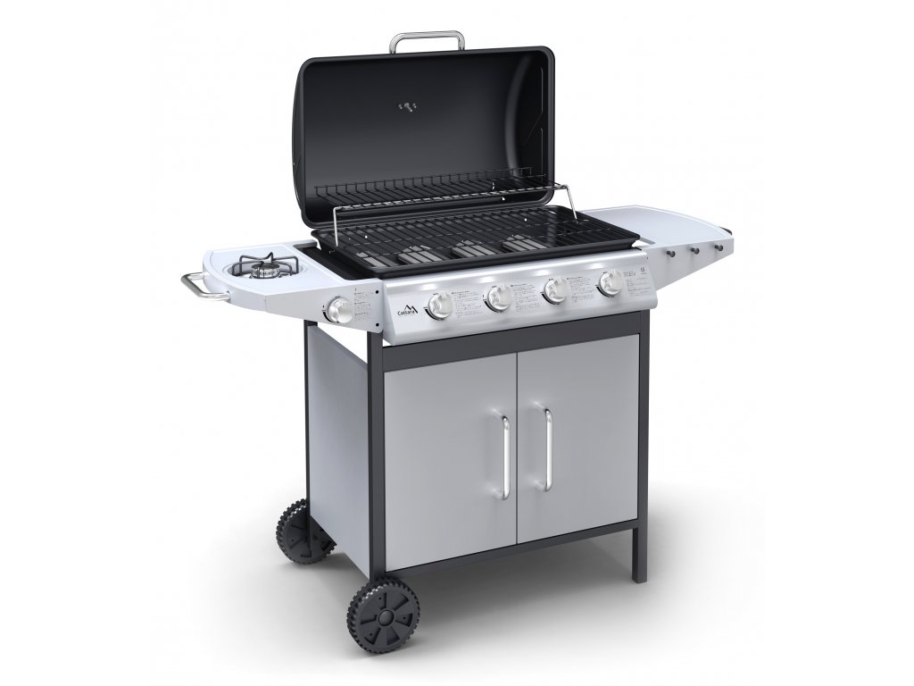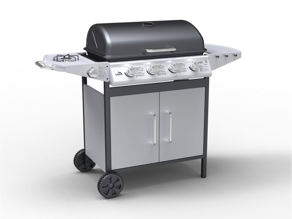 Gril je pojízdný (2 kolečka), je vybaven sklopným víkem s teploměrem a odkládacími poličkami s háky na příslušenství. Dále je vybaven přídavným bočním vařičem se samostatnou regulací a piezo zapalováním. Ve střední části je uzavíratelná skříňka s dvířky. Součástí je i spojovací hadice k plynové lahvi a redukční ventil. Díky sklopné boční poličce se gril snadno skladuje.