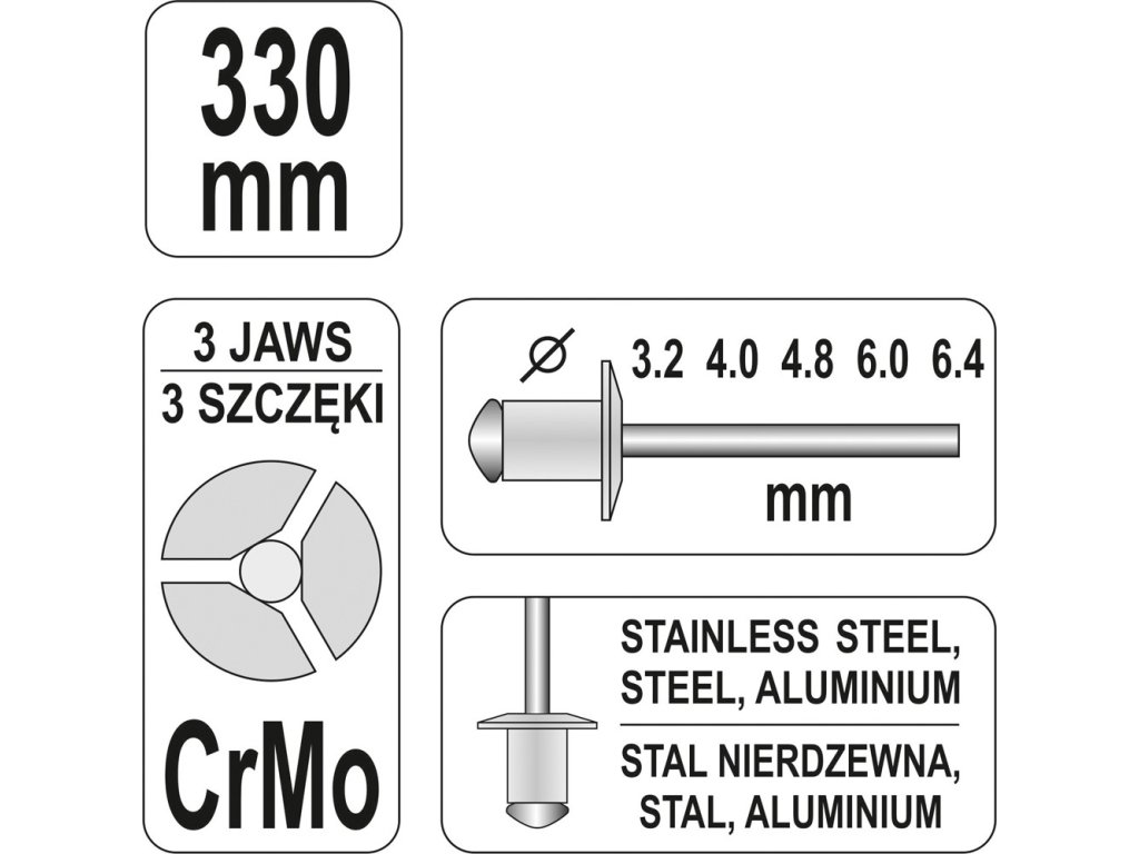 Klešte mají délku 330 mm, čelisti jsou precizně zpracovány z CrMo oceli a jsou určené pro nýty 3,2 - 6,4 mm.