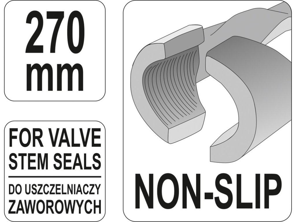 Kleště jsou opatřeny úzkými, tvrzenými, vroubkovanými čelistmi Non-Slip, sloužícími pro bezpečné stažení těsnění dříku ventilů.