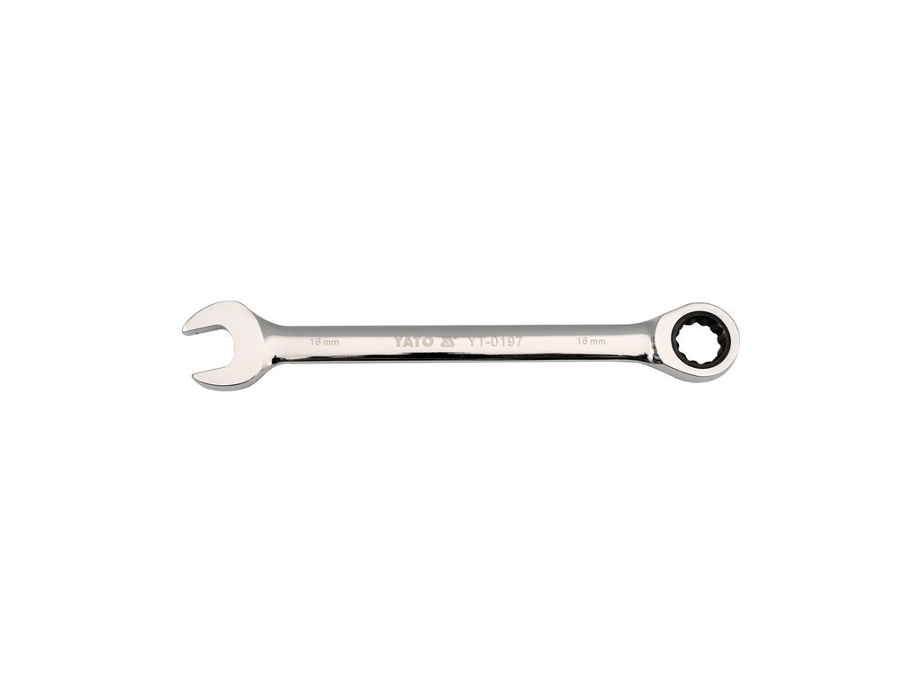 Ráčnový očkoplochý klíč Yato - na jedné straně klasický stranový klíč, na straně druhé očkový klíč s dvanáctihranným profilem vybaveným ráčnou s jemným dělením 72 zubů. Tělo klíče je vyrobeno z chromvanadiové oceli CrV6140. Povrch je vyleštěn do vysokého lesku.