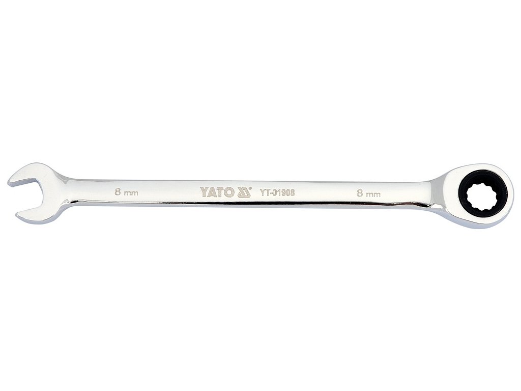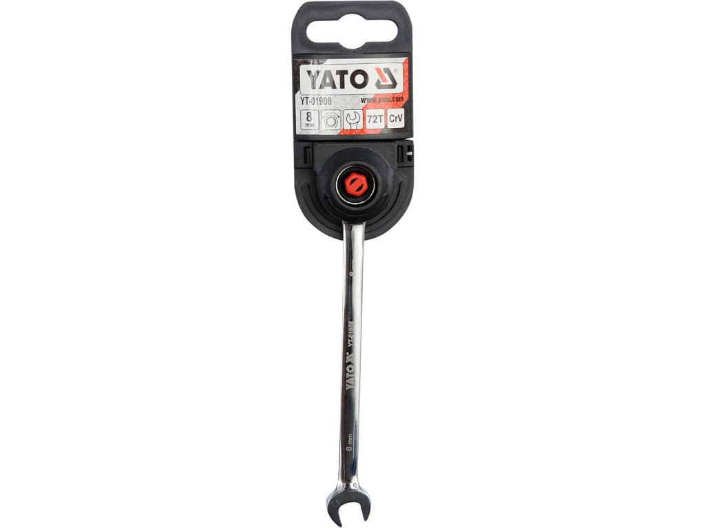 Ráčnový očkoplochý klíč Yato - na jedné straně klasický stranový klíč, na straně druhé očkový klíč s dvanáctihranným profilem vybaveným ráčnou s jemným dělením 72 zubů. Tělo klíče je vyrobeno z chromvanadiové oceli CrV6140. Povrch je vyleštěn do vysokého lesku.