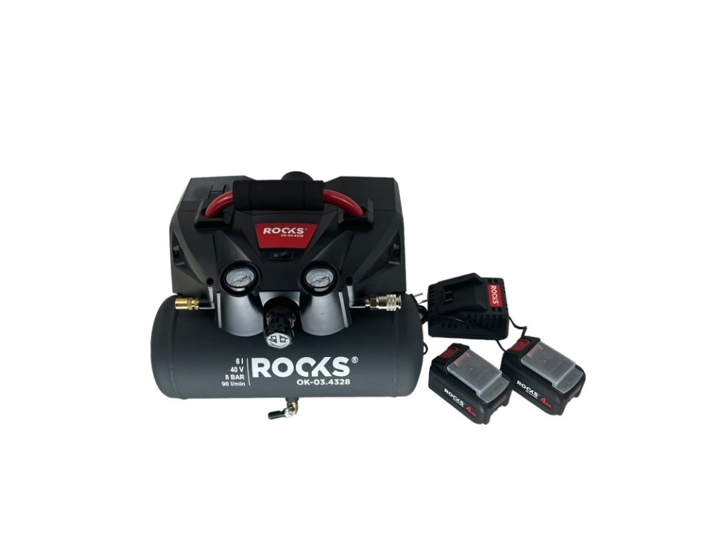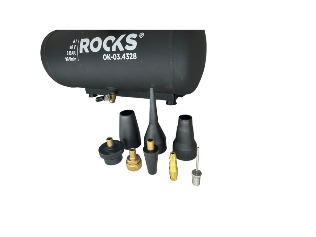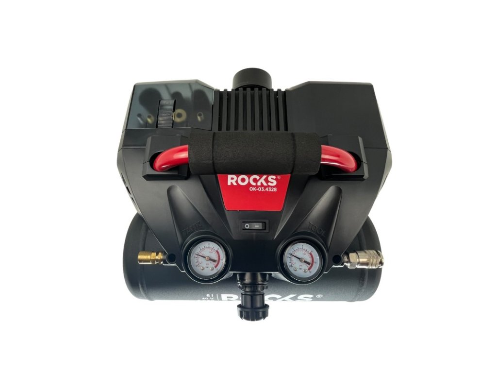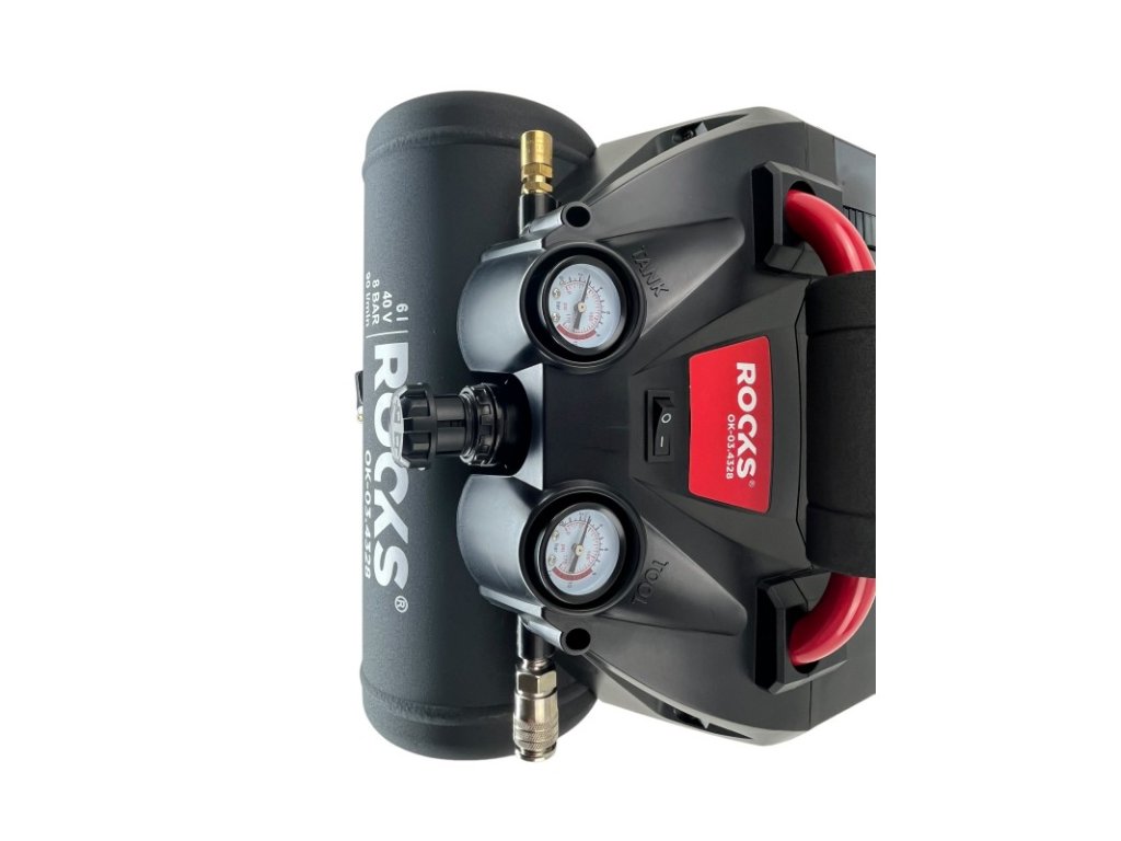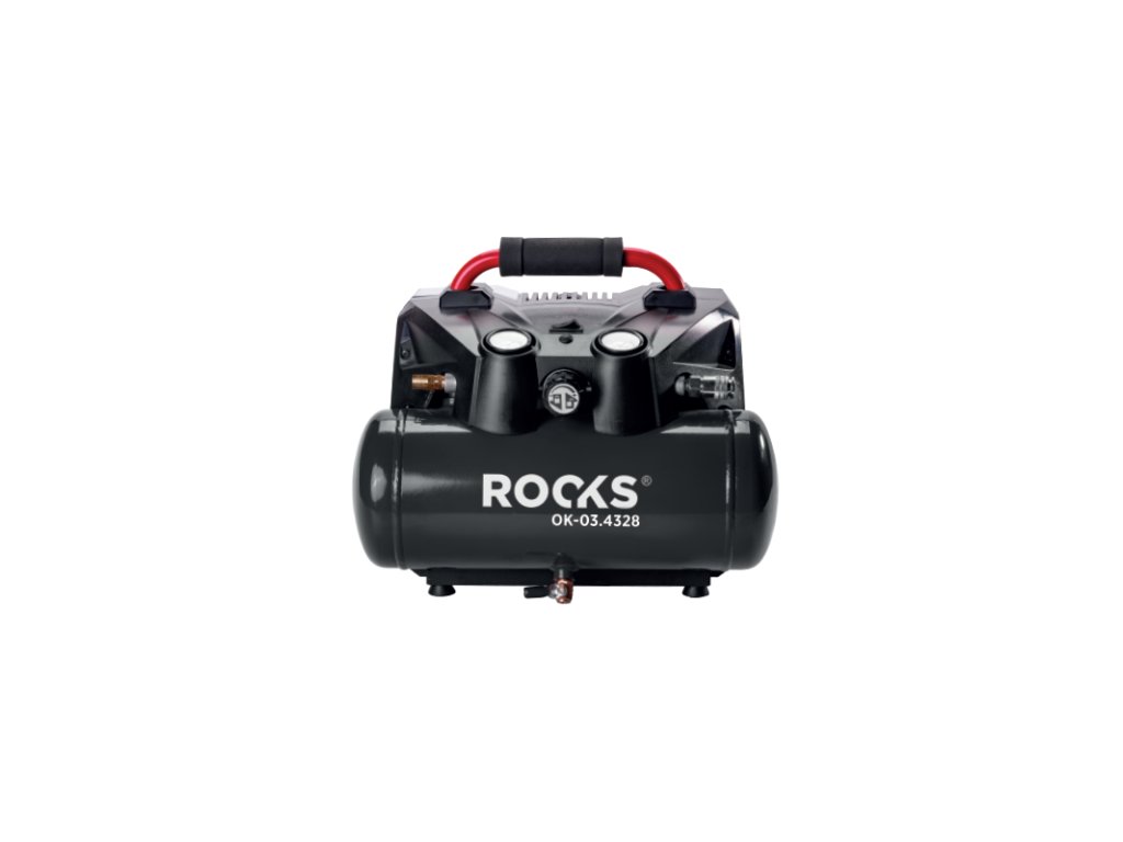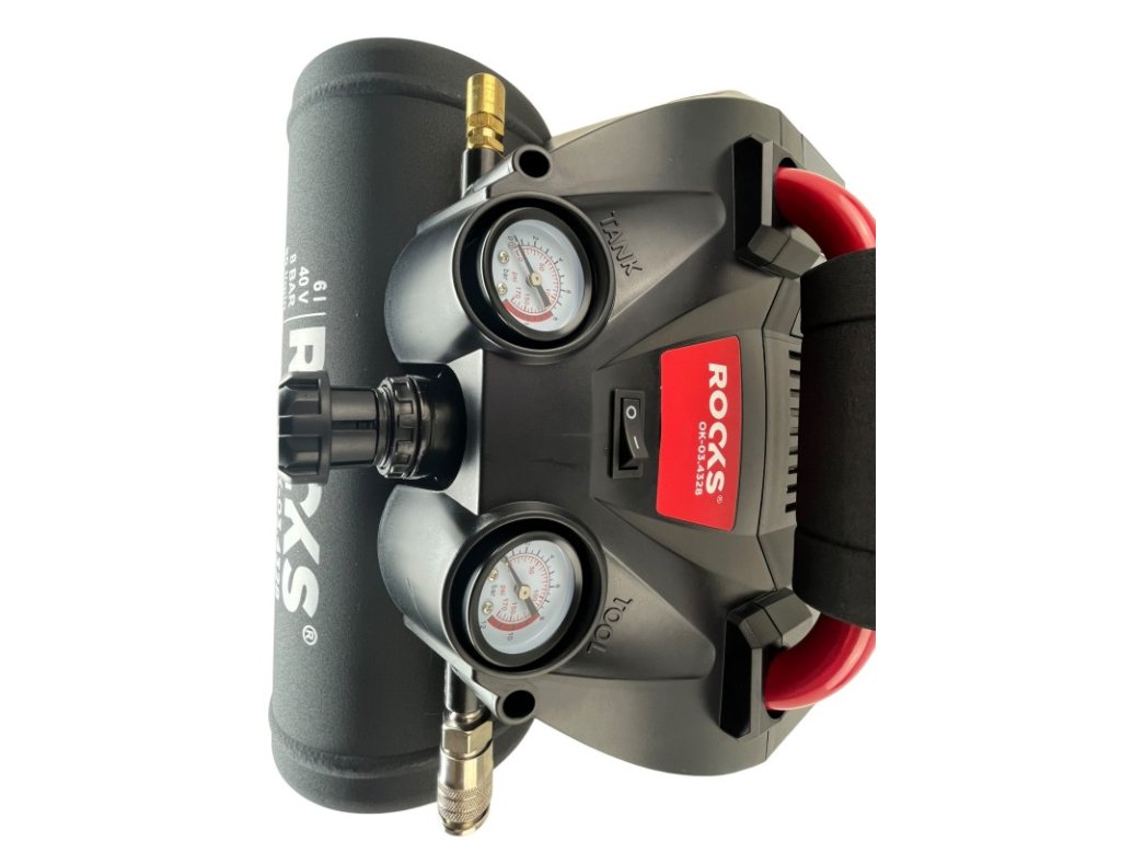 Kompresor ROOKS je vybaven pojistným ventilem, dvěma tlakoměry (hlavní měří tlak v nádrži a druhý zajišťuje snížený tlak za regulátorem), standardním rychlospojkou hadice a ventilem pro vypouštění kondenzátu.