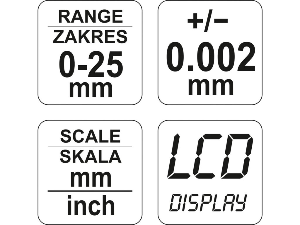 Precizní zařízení pro rozsah 0 - 25 mm s přesností na 0,01 mm (při pracovní teplotě 5-40 °C).