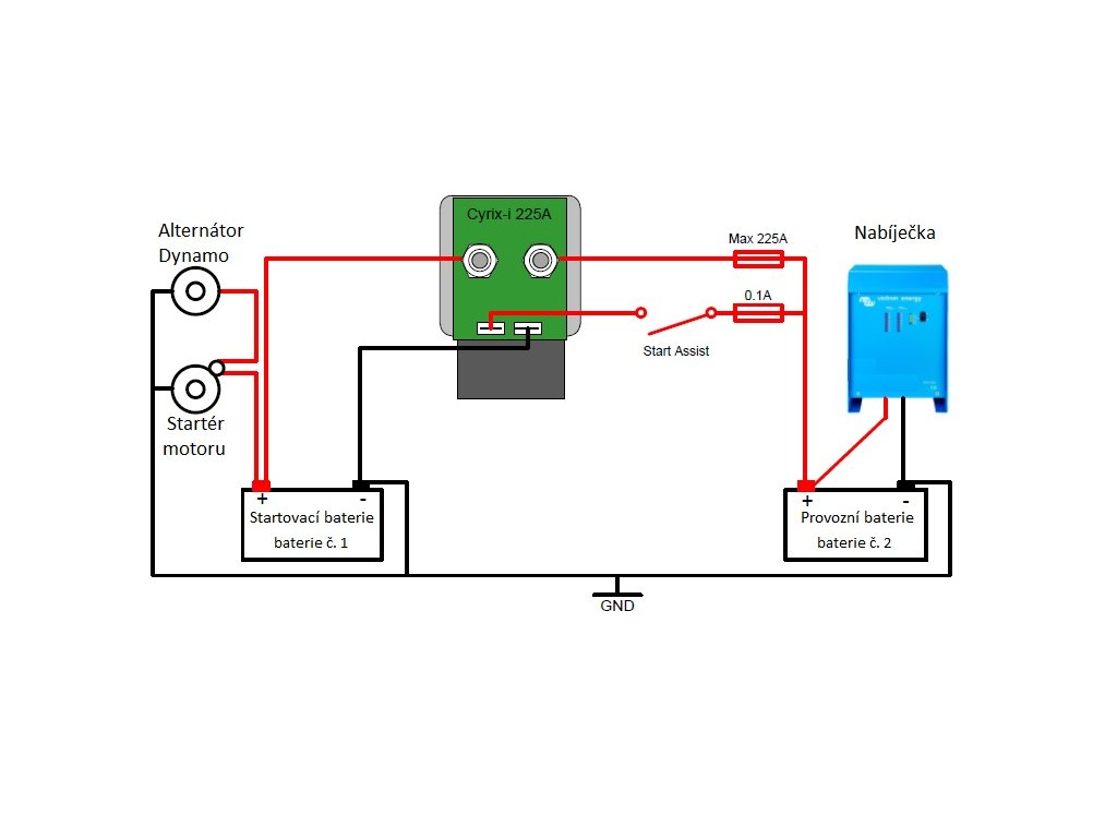 Inteligentní propojovač baterií Cyrix-ct řídí nabíjení a odpojování startovací a provozní baterie. Pokud je na jedné z baterií dosaženo napětí 13,0 V (26 V) po dobu 10 minut nebo 13,8 V (27,6 V) po dobu 4 sekund, Cyrix-ct baterie propojí a dochází k nabíjení obou baterií současně do plně nabitého stavu. Jakmile na jedné z baterií klesne napětí pod 12,8 V (25,6 V) po dobu 10 minut nebo 11,8 V (23,6 V) po dobu 4 sekund, dojde k vzájemnému odpojení baterií. Toto propojování a odpojování funguje obousměrně. Baterie mohou být odlišných kapacit, typů a konstrukcí. Předpokládá se, že každá baterie napájí své vlastní spotřebiče.