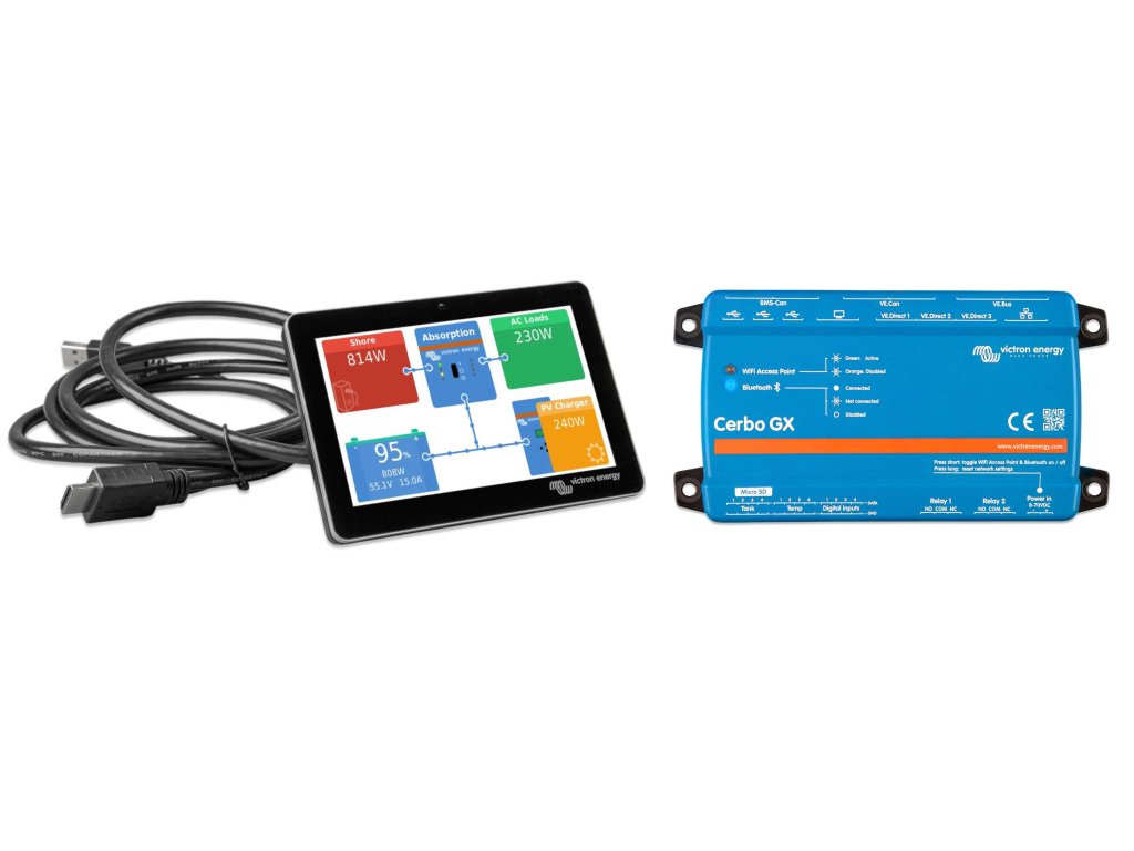 GX Touch 50 společně s Cerbo GX - toto zbrusu nové komunikační centrum umožňuje bezpečně kontrolovat solární systém odkudkoliv, a maximalizuje jeho výkon. Jednoduše se připojíte přes portál na dálkové ovládání Victron Remote Management (VRM), nebo získejte přímý přístup prostřednictvím samostatného displeje GX Touch 50, MFD nebo aplikace VictronConnect přes Bluetooth. Tato novinka v řadě GX spojuje všechny nejlepší charakteristiky konektivity a představuje inteligentní řešení pro energetické systémy ve zcela novém světle.