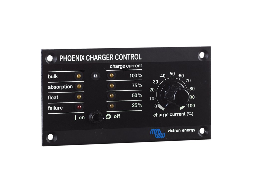 Panel pro vzdálené ovládání a sledování nabíječek řady Phoenix. Umožňuje páčkovým spínačem vzdáleně zapínat a vypínat připojené zařízení. Panel zobrazuje pomocí žlutých LED diod fázi nabíjení a červenou LED diodou oznamuje poruchový nebo chybový stav. Dále zobrazuje aktuální míru nabíjecího proudu v procentech, současně lze jednoduchým otočným ovladačem tuto hodnotu měnit. Vhodné v případě napájení z výkonově omezené sítě nebo malých elektrocentrál. Pomocí panelu lze nastavovat (strana 8 manuálu níže)maximální proud rychlého nabíjení (Bulk), hodnotu absorpčního napěti (Absorption), hodnotu udržovacího napětí (Float), časový interval opakování absorpce, maximální délka absorpčního času v hodinách, fixní nebo adaptivní absorpční čas a typ baterie. Propojení s ovládaným zařízením je pomocí datového UTP kabelu s koncovkami RJ45 (není součástí dodávky). Panel je určen pro instalaci na zeď pomocí montážního rámečku 65 x 120 mm, do elektrokrabice a podobně. Zařízení je použitelné pro všechny modely nabíječek Phoenix, tedy 12 V/30A, 12 V/50 A, 24 V/16 A a 24 V/25 A. Napojení na nabíječku je pomocí standardního datového UTP kabelu s koncovkami RJ 45 (není součástí dodávky). Jde o volitelné příslušenství k nabíječkám Phoenix, které jsou standardně ovládané přímo na zařízení.