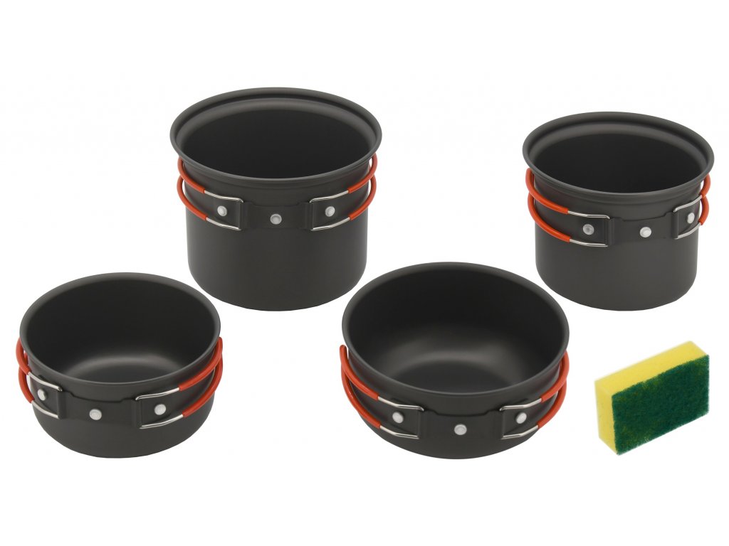 Sada je tvořena 2x kastroly 14 x 6,5 cm; 12 x 6,5 cm a 2x kotlíky s rozměry 13 x 10 cm; 15 x 11 cm, součástí sady je také houbička na mytí nádobí.