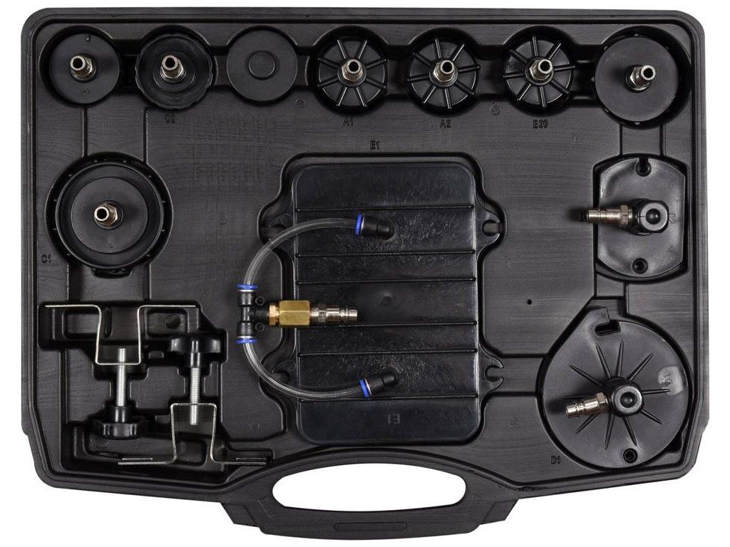 Speciální vysokotlaká nádrž o objemu 5 l umožňuje plnění stlačeným vzduchem, díky čemuž může zařízení fungovat bez nutnosti neustálého napájení. Sada obsahuje 11 adaptérů.