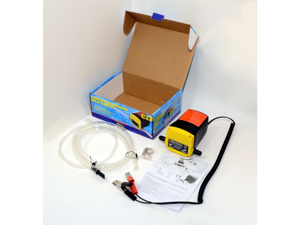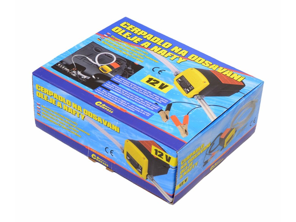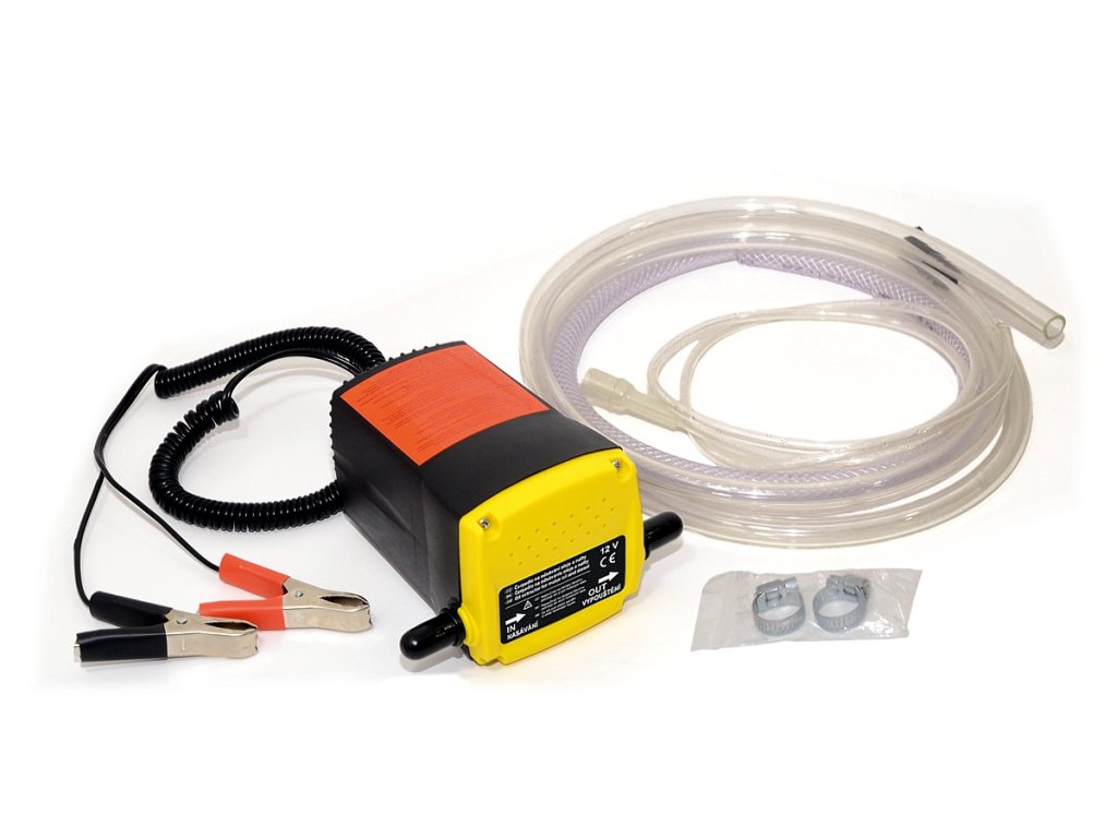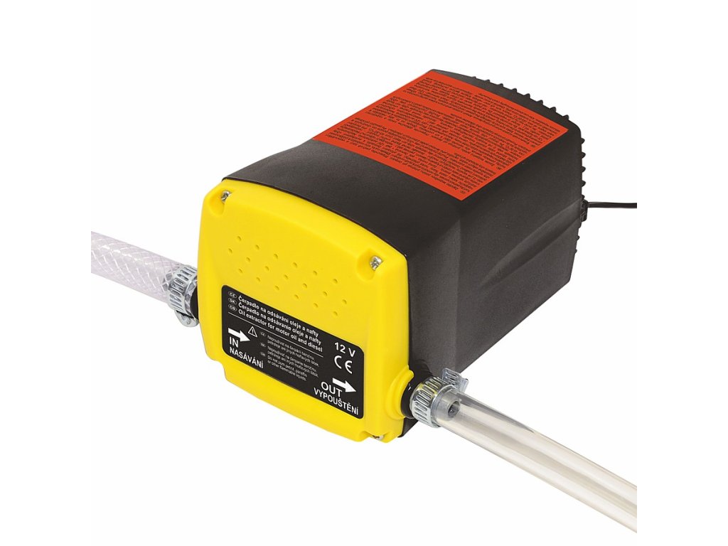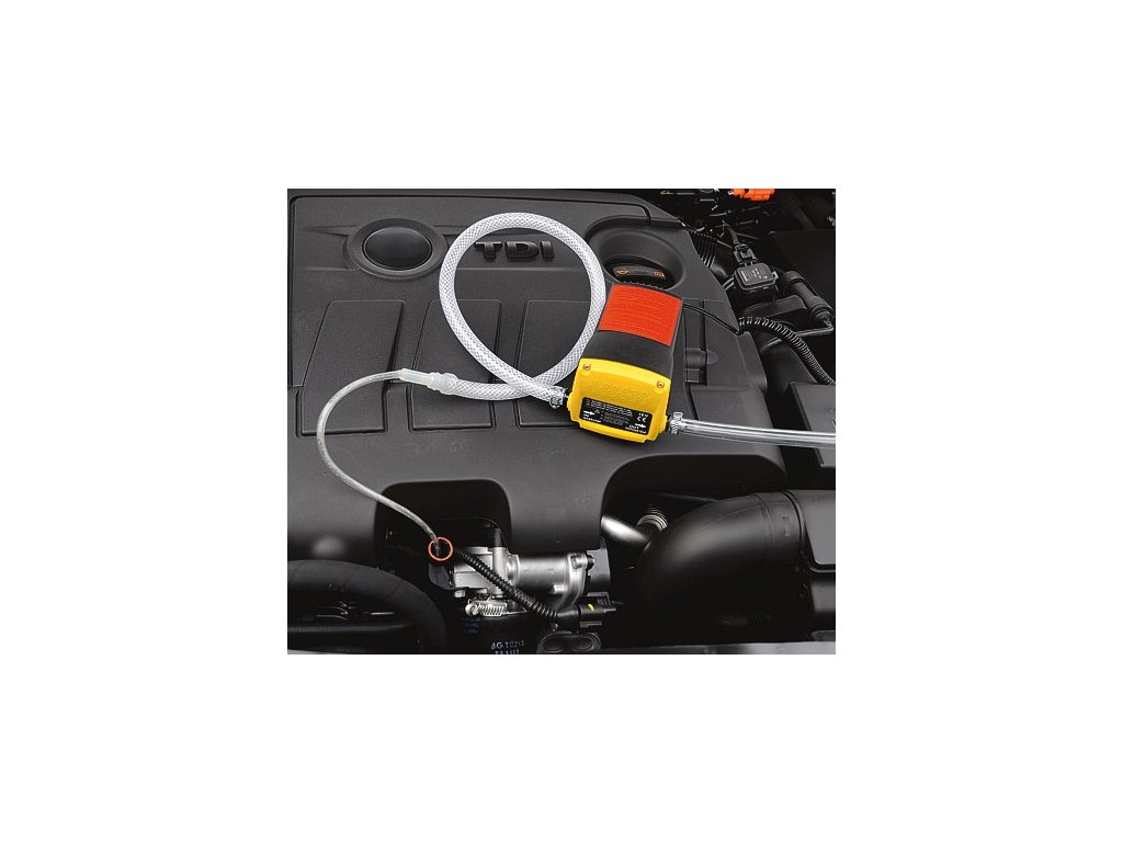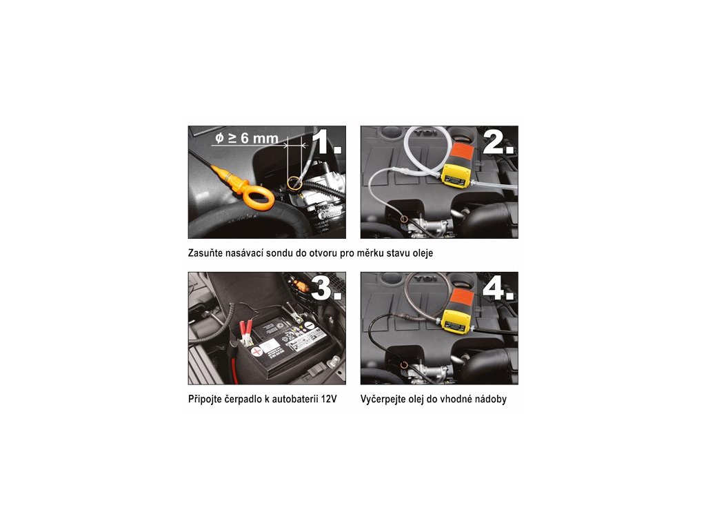 Napájení 12V pomocí svorek, ideální k připojení na autobaterii 12V. Vhodné pro jednoduchou výměnu motorového oleje. Není nutné hledat vypouštěcí šroub oleje, stačí jen zasunout nasávací sondu do otvoru pro měrku stavu oleje (až do vnitřního průměru 6 mm) a olej vysát do připravené nádoby.