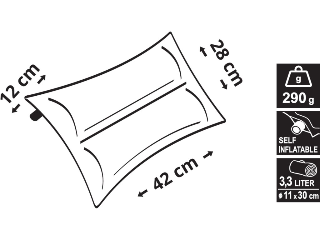 Rozměry 42 x 28 cm a výška 12 cm, dělají z polštáře pohodlný a příjemný doplněk pro kemping, zejména při přenocování ve spacím pytli. Polštář však může být využit i jako pohodlná, izolační podložka k sezení.
