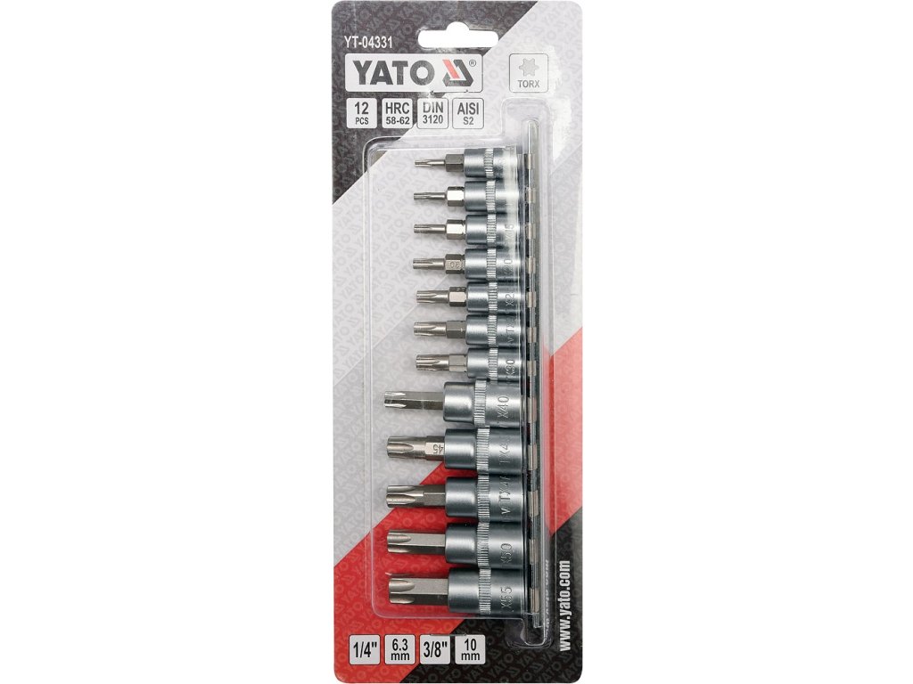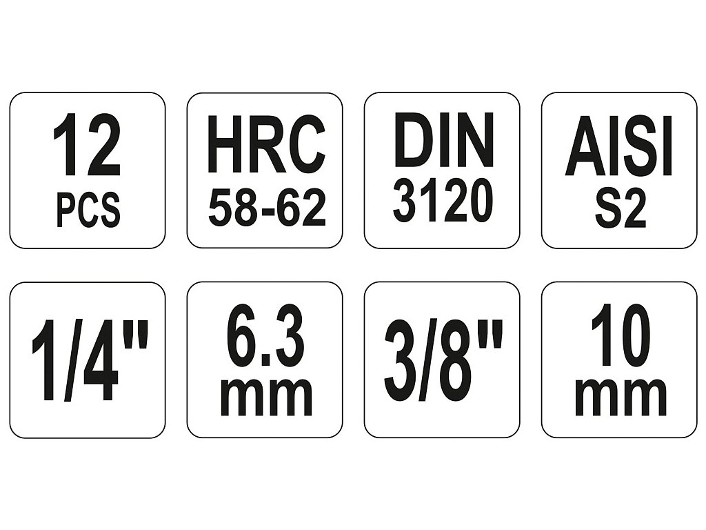Délky bitů 37 a 48 mm, určené pro 1/4" a 3/8" ráčny. V sadě je kovový držák bitů a samotné bity T8-T55. Splňuje normu DIN 3120 pro vysoce-zatěžovatelné nástavce.