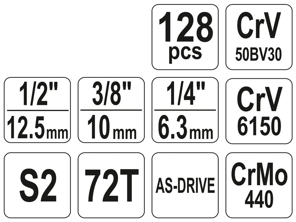 Gola sada 1/2", 3/8", 1/4" + příslušenství 128 ks
