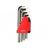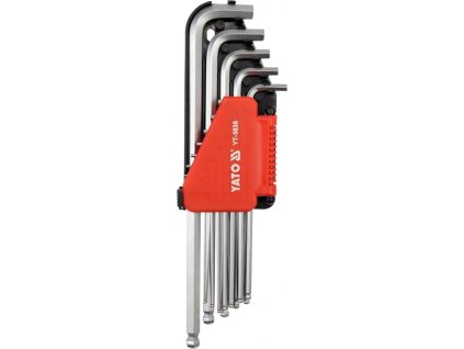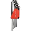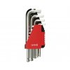 Sada 9 ks delších imbusových klíčů běžných rozměrů s kuličkou, uložených v přehledném, plastovém držáku.