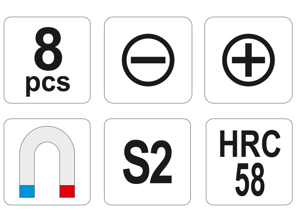 Vyrobeno z nerezové oceli S2 tvrzené na HRC 58. Hrot šroubováků je kalený a pískovaný, což zabezpečuje jejich dlouhodobou pevnost a životnost.