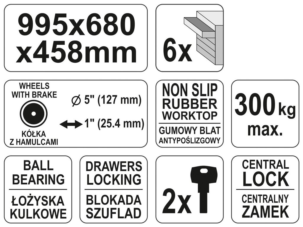 Skříňka o rozměrech 995 x 680 x 458 mm je zhotovena z oceli, její nosnost činí 300 kg.