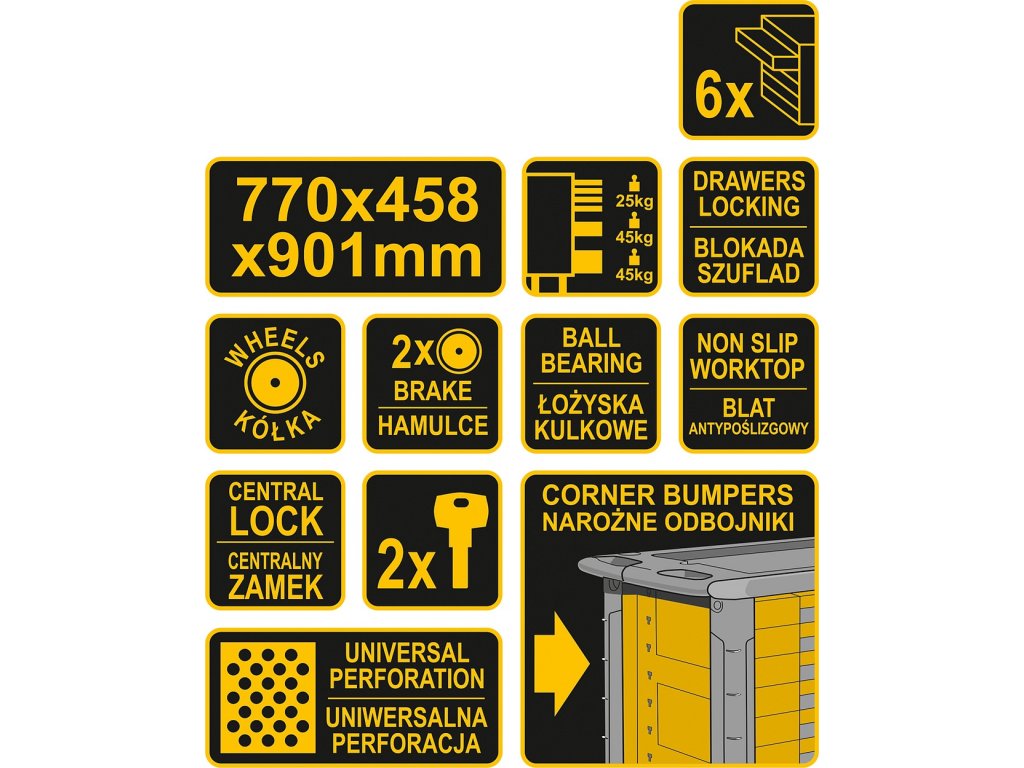 Horní deska z pevného polypropylenu unese až 150 kg. První 4 šuplíky mají nosnost 25 kg a poslední 2 spodní šuplíky unesou 45 kg, všechny jsou pak uzamykatelné.