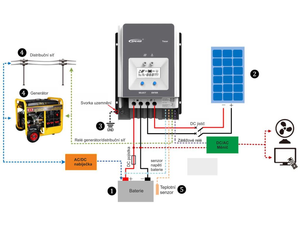 •             Automaticky řízené relé síť/generátor usnadňující vytvoření hybridního systému napájení