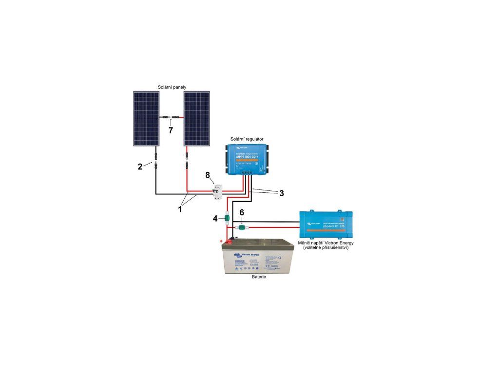 Sestava obsahuje kabel 6 mm² dlouhý 15 m s konektory MC4 pro připojení k panelu. Elektrikář následně zakončí kabely vedoucí do regulátoru dutinkami a připojení k baterii vhodnými oky a DC jištěním dle typu instalace.