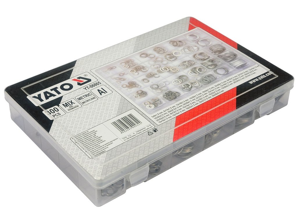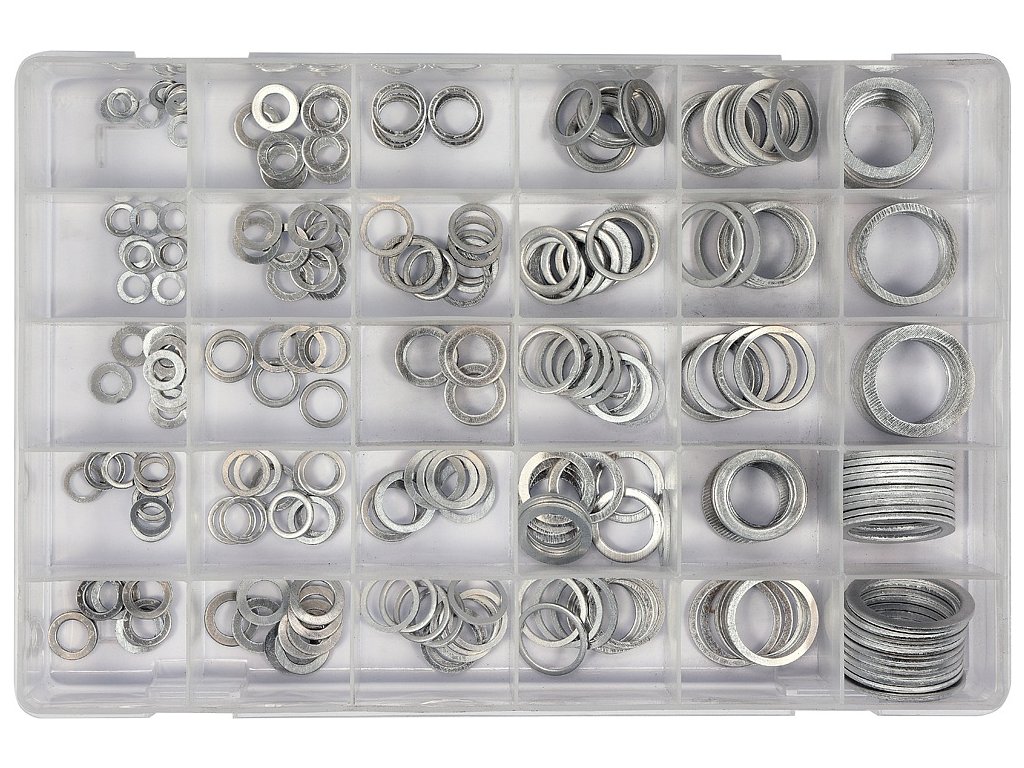 Sada 300 ks kvalitních hliníkových podložek rozměrů od 5 x 9 mm do 28 x 36 mm, dohromady 30 druhů podložek po 10 ks.